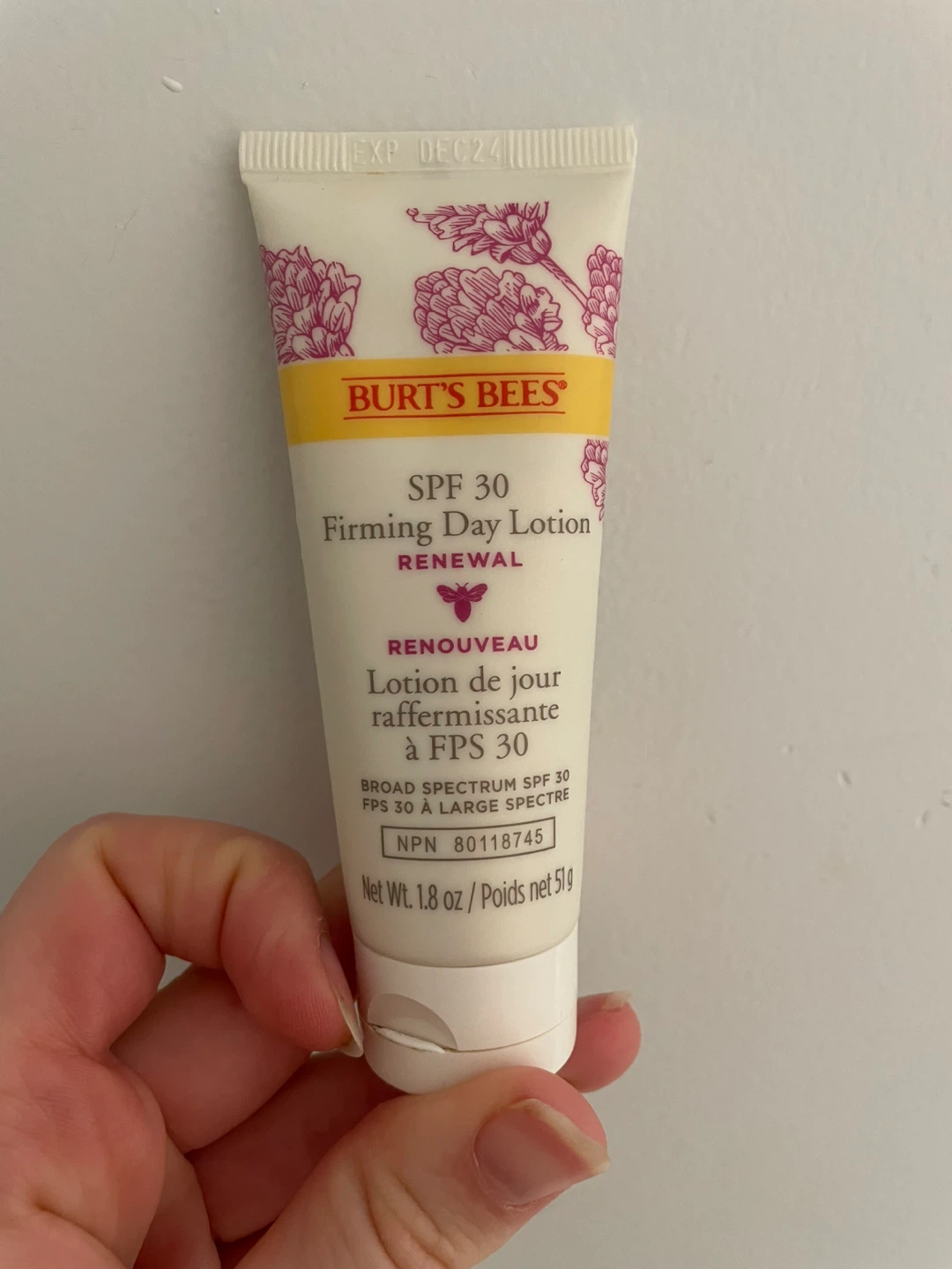 Burt's Bees SPF 30 Firming Day Lotion with Renewal complex. It's a broad spectrum sunscreen with SPF 30. Net weight is 1.8 oz or 51g.