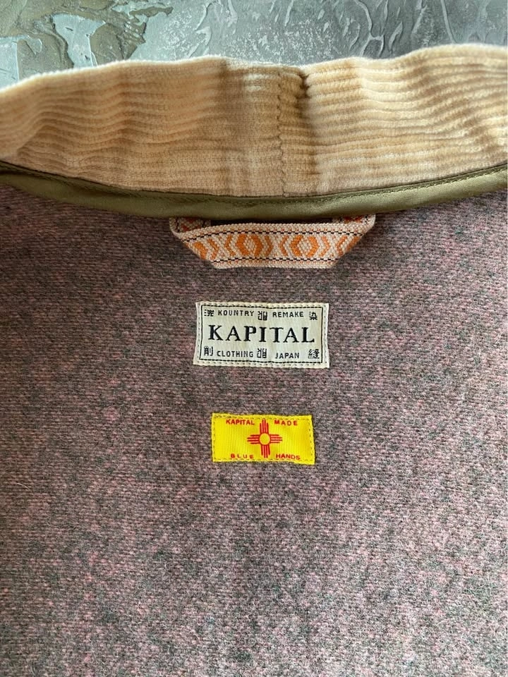 Kapital Kountry jacket with detailed stitched patterns, corduroy sleeves and trim. Features 2 pockets on seams, and 2 pockets inside. Purchased in Tokyo. Sizing is men's L. As new, excellent condition.