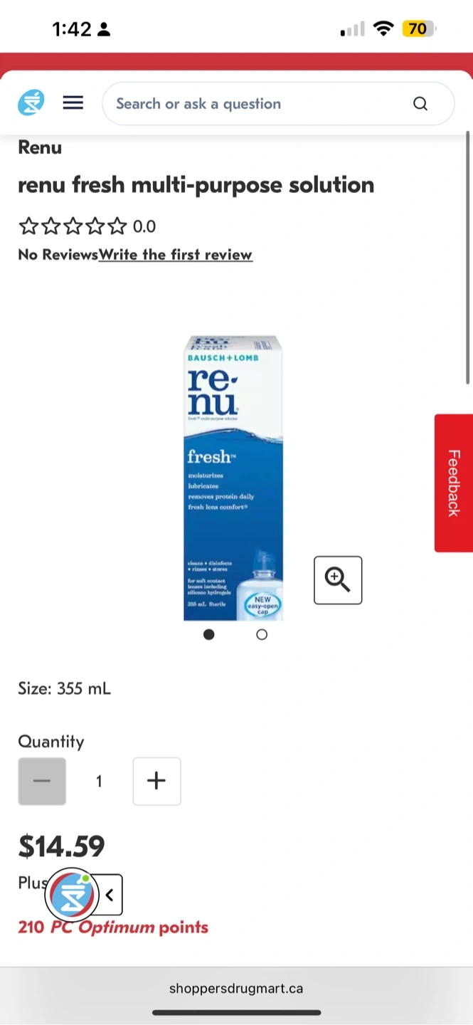 Selling a bottle of Renu Fresh multi-purpose solution for contact lenses. It cleans, rinses, disinfects, and removes protein daily. The bottle contains 355 mL of solution. Originally bought for $14.59 before tax