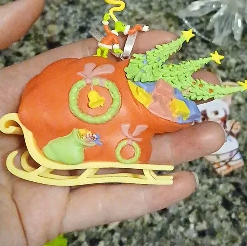 Selling a cute Grinch-themed Christmas ornament! It features the Grinch on a sleigh filled with Christmas trees and presents. Perfect for adding a touch of Whoville to your holiday decor