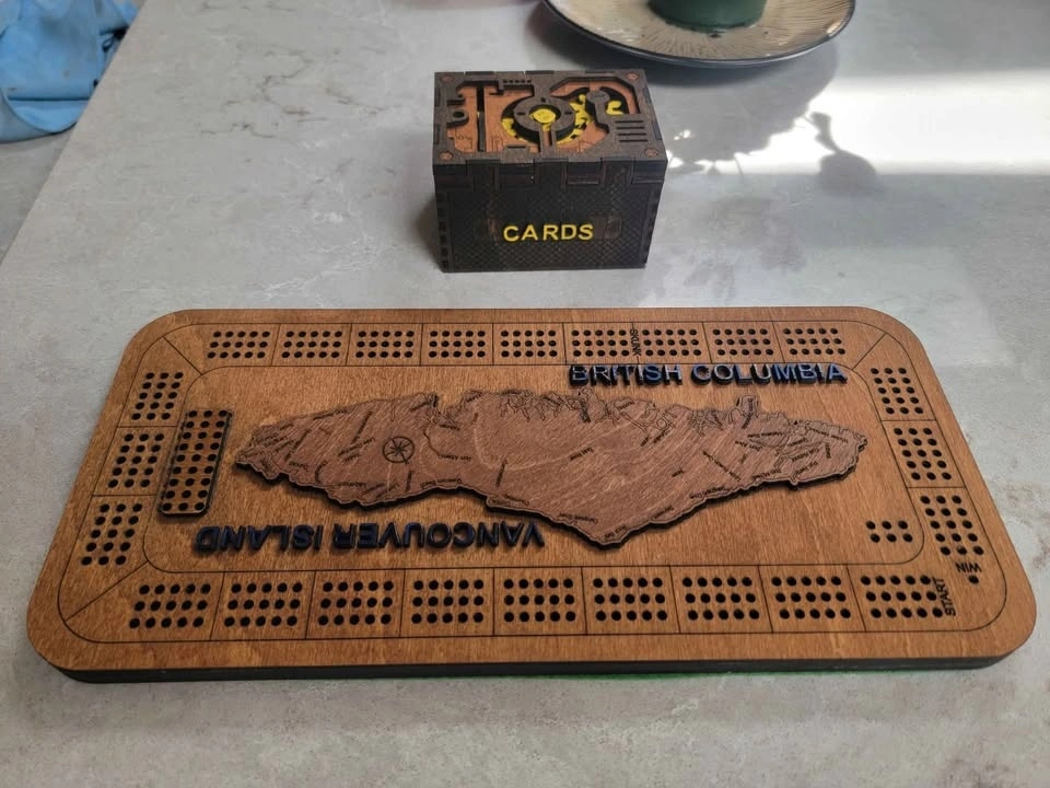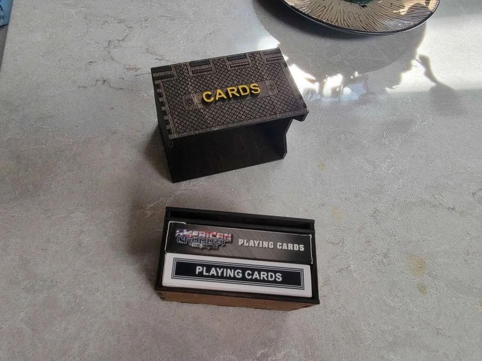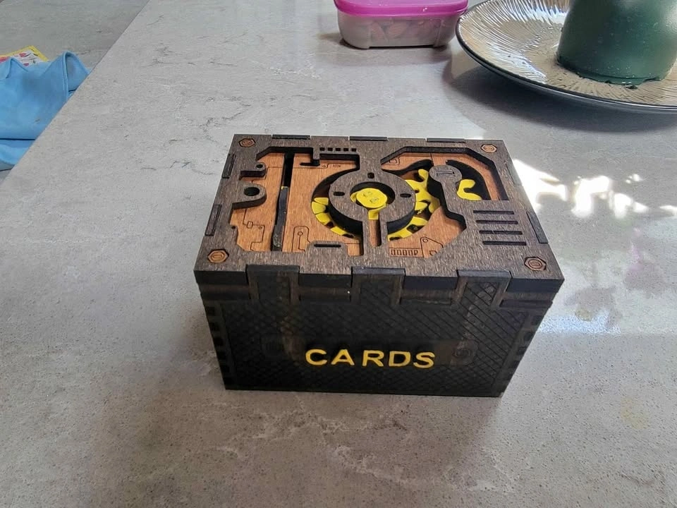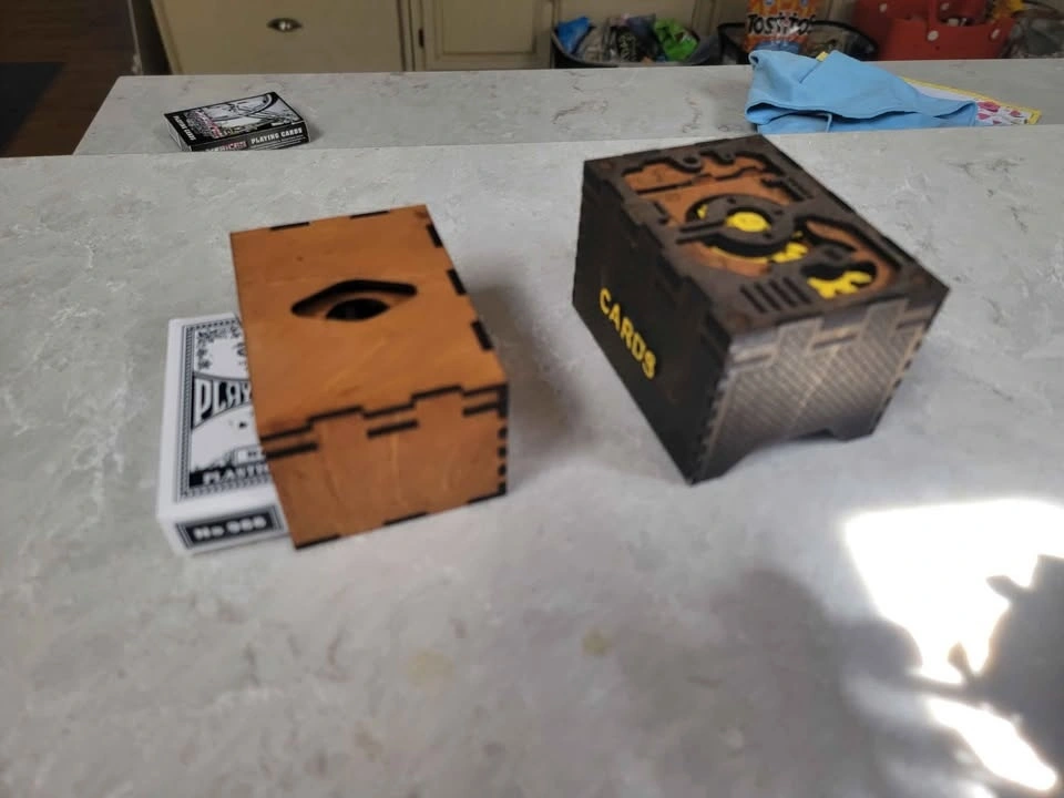Here is a really cool card holder box for playing cards or collectible cards such as Pokémon or any other collectible cards of the same. Can be custom labeled with a person's name or whatever cards are being kept inside protected. Color stained Birch veneer ply can be stained any color arrangement desired. Could also be painted. Space to hold up to 2 boxes of playing cards as shown or up to 100+ collectible cards. Outer box dimensions: 10.5 X 8 X 6.5 cm. I am able to take the following for payment: Cash is King! Debit (In Person with Square Device) Credit Card (In Person with Square Device) Sorry, I don't do PayPal. See the other cool things I build (over 100) here: https://timothyflath.smugmug.com/Personal/Laser-Cutting-Engraving-Products