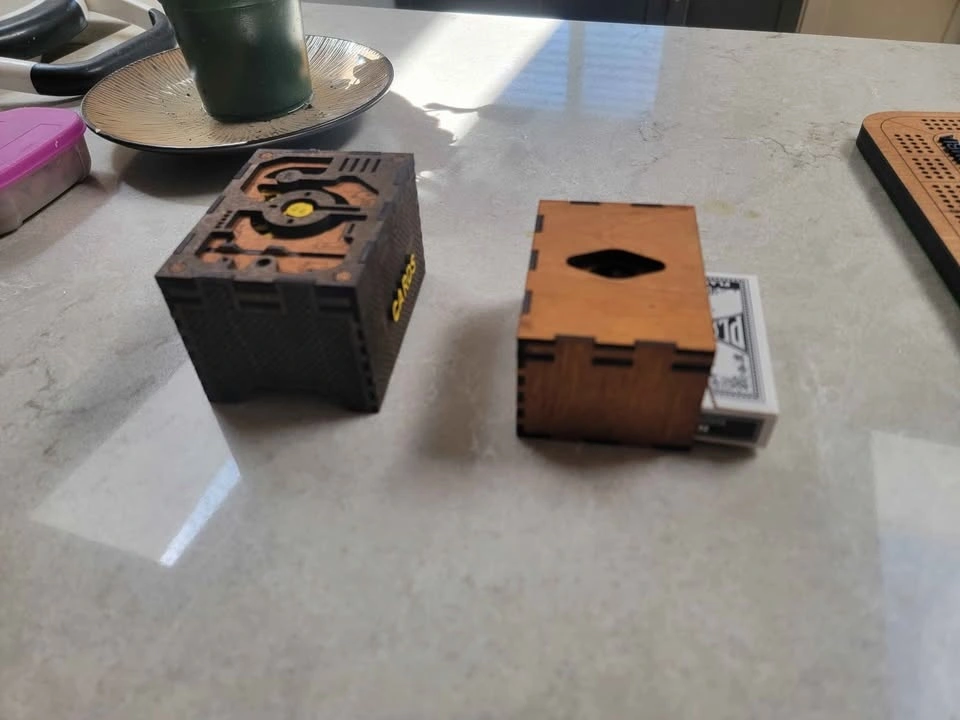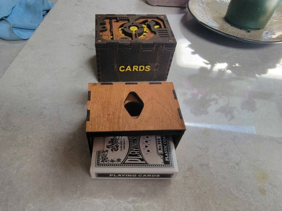 Here is a really cool card holder box for playing cards or collectible cards such as Pokémon or any other collectible cards of the same. Can be custom labeled with a person's name or whatever cards are being kept inside protected. Color stained Birch veneer ply can be stained any color arrangement desired. Could also be painted. Space to hold up to 2 boxes of playing cards as shown or up to 100+ collectible cards. Outer box dimensions: 10.5 X 8 X 6.5 cm. I am able to take the following for payment: Cash is King! Debit (In Person with Square Device) Credit Card (In Person with Square Device) Sorry, I don't do PayPal. See the other cool things I build (over 100) here: https://timothyflath.smugmug.com/Personal/Laser-Cutting-Engraving-Products