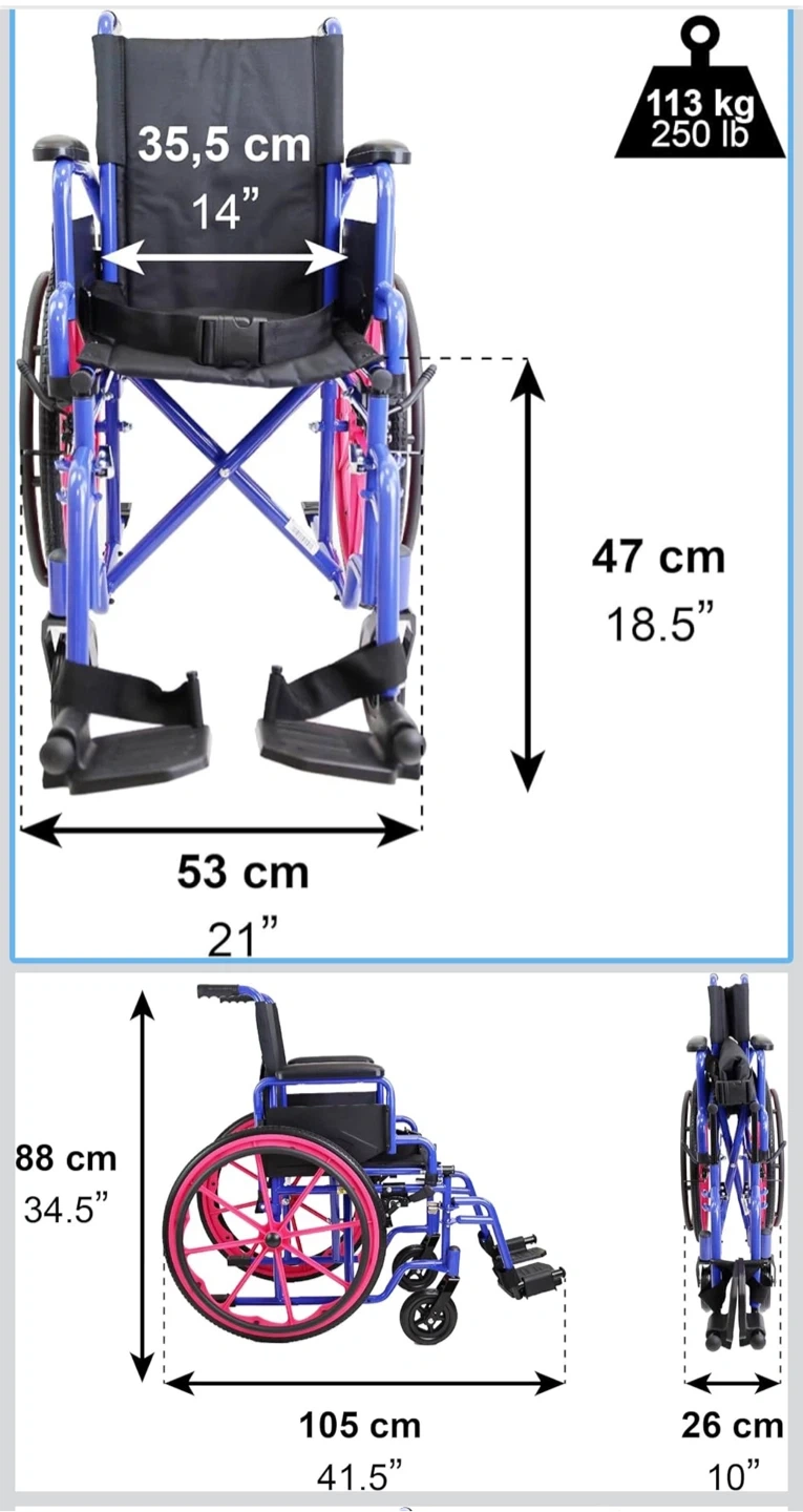This is a blue and pink lightweight wheelchair with a 14-inch seat width. It folds for transport and storage. Maximum weight capacity is 250 lbs.