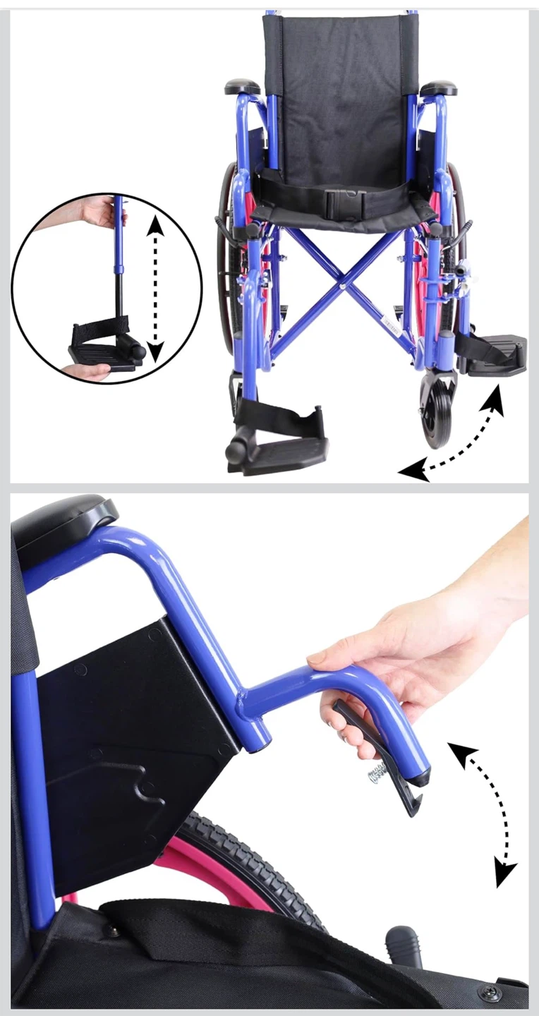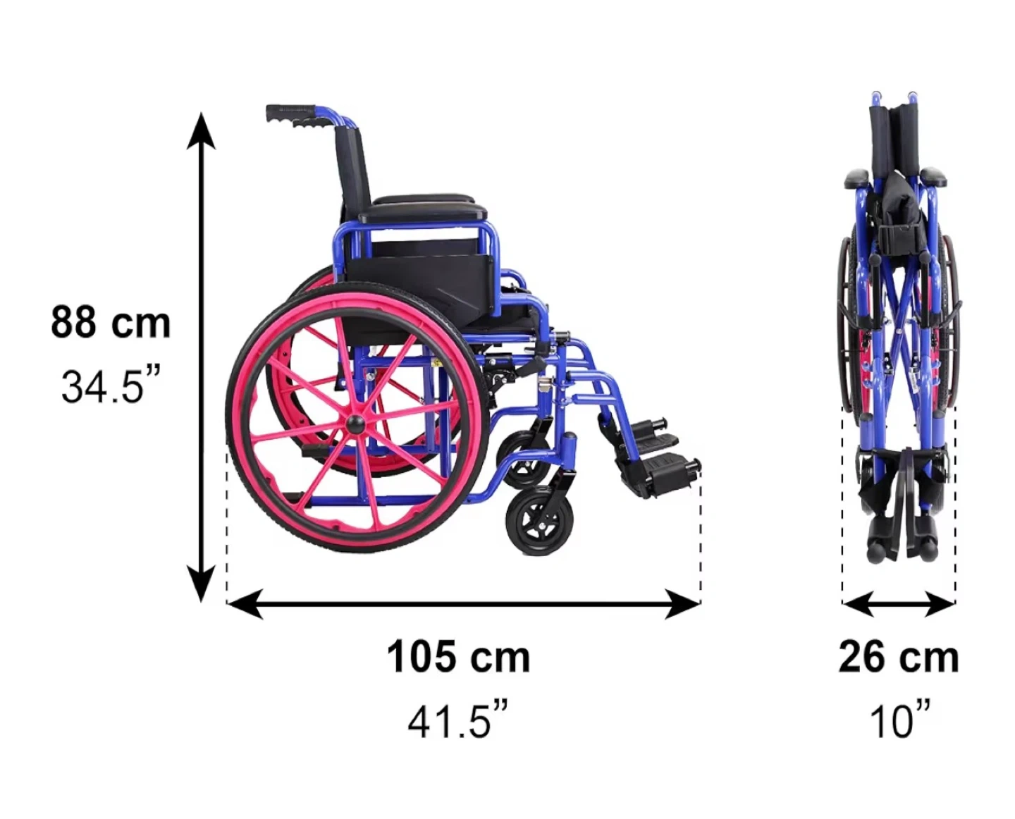 This is a blue and pink lightweight wheelchair with a 14-inch seat width. It folds for transport and storage. Maximum weight capacity is 250 lbs.