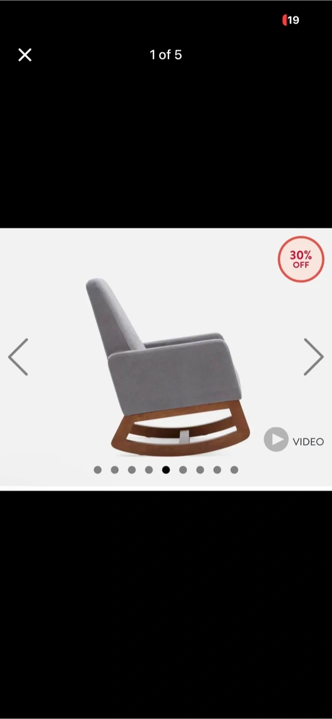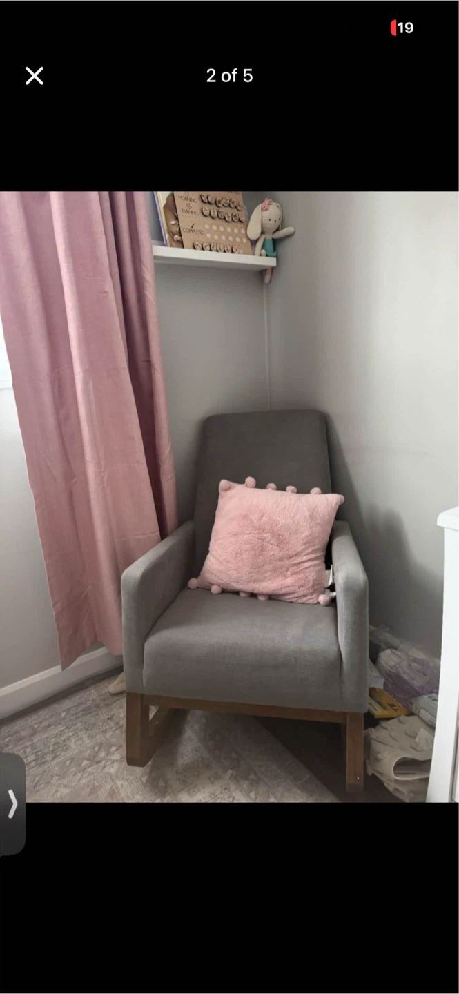 This is a Cedrick mid-century modern rocking armchair in grey. It's upholstered in fabric with a wooden base. Dimensions are 40" H x 26" W x 26" D. Seat depth is 21" and seat height is 20". Arm height is 26" from the floor.