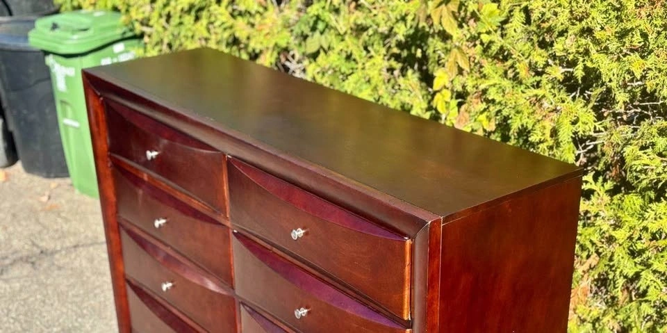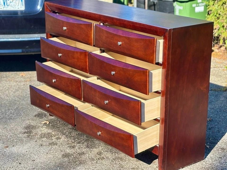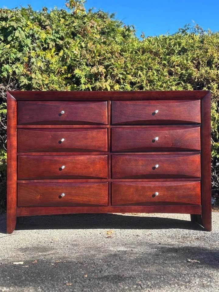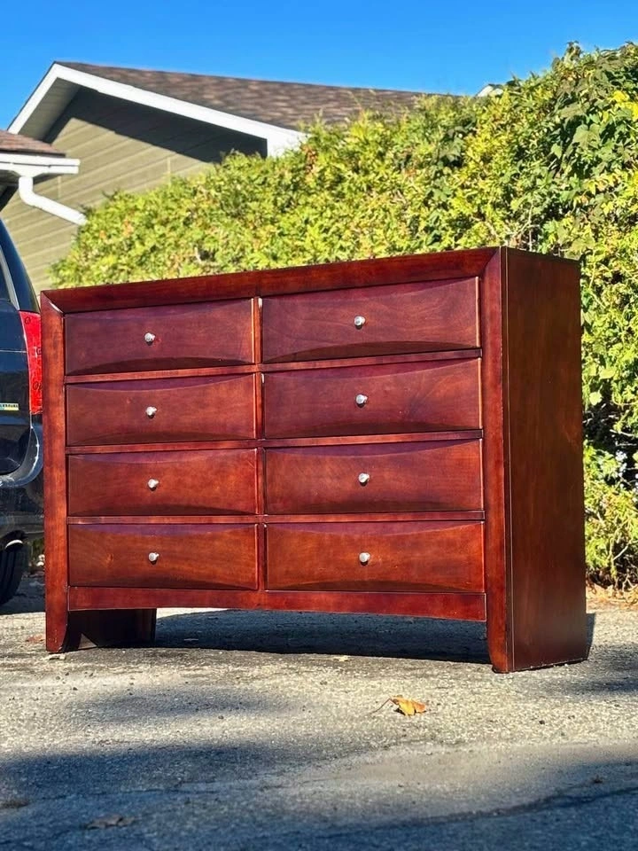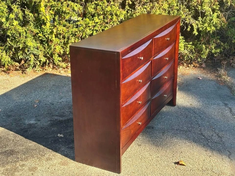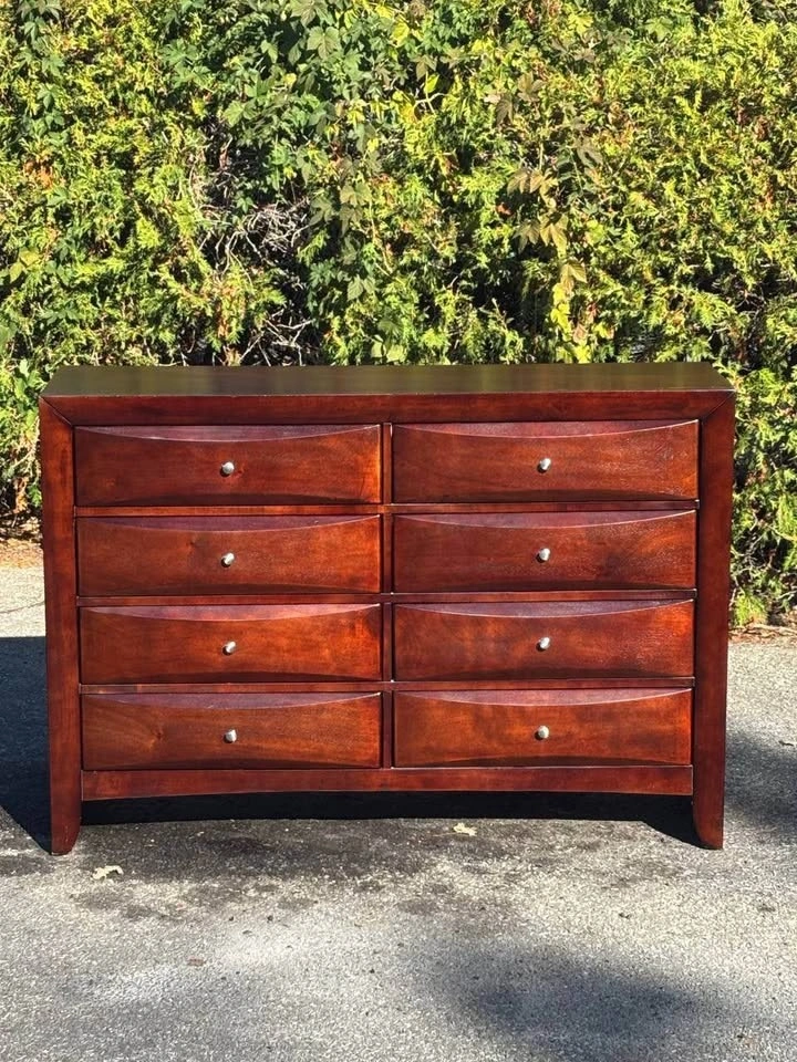 Large solid wood dresser with 8 smooth-sliding drawers.