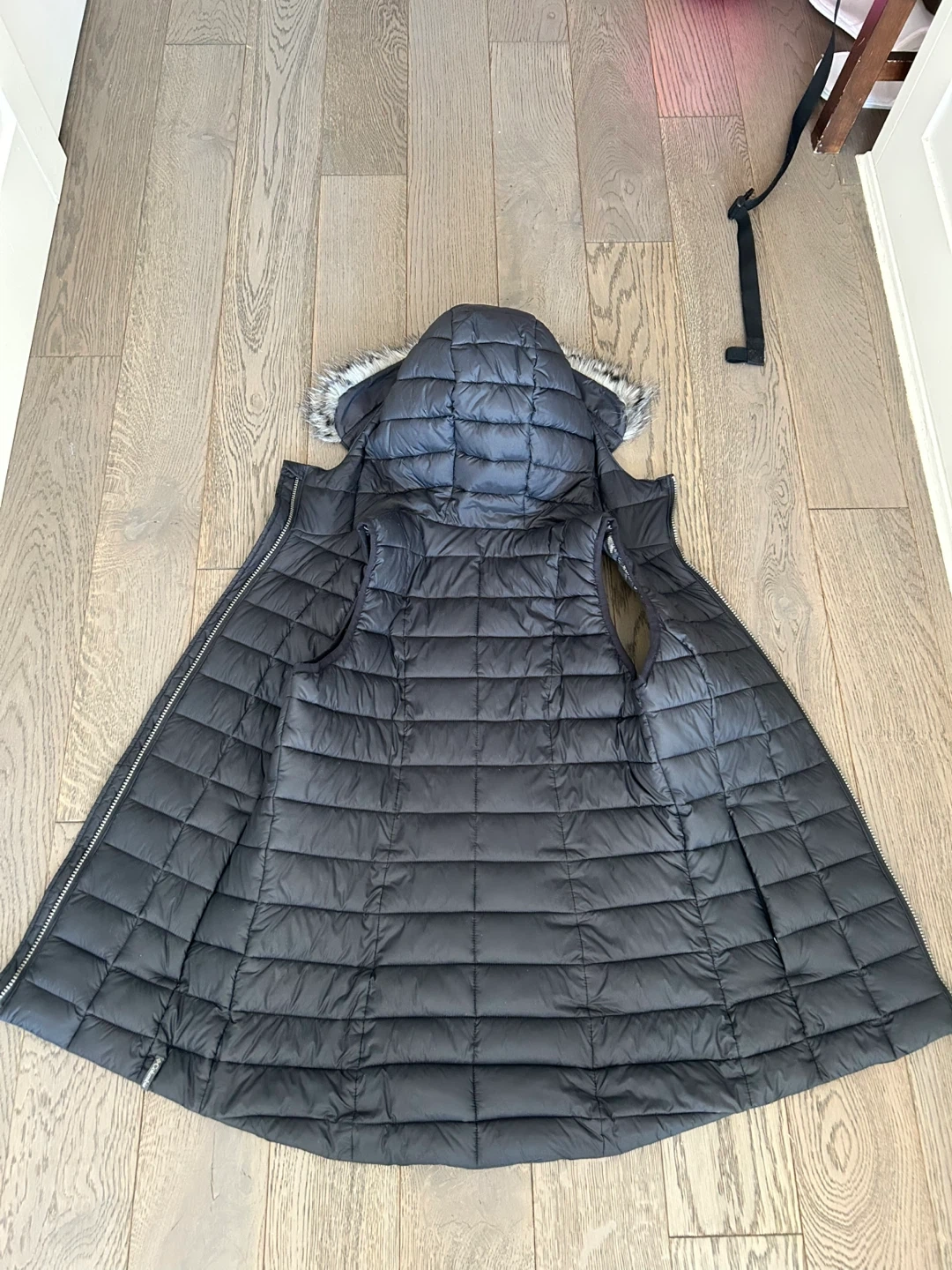 This is a black Columbia vest with a removable hood and faux fur trim. It's insulated with Omni-Heat technology for extra warmth. Size XS.