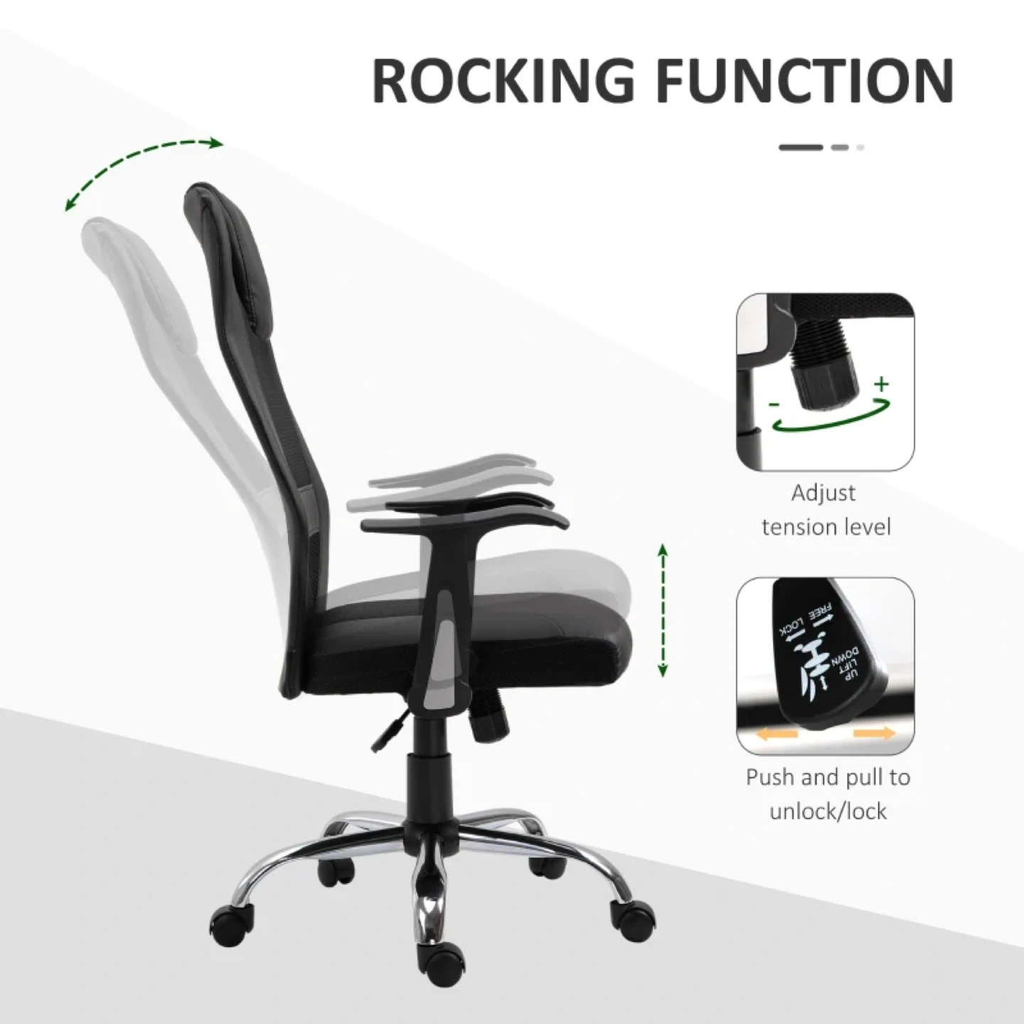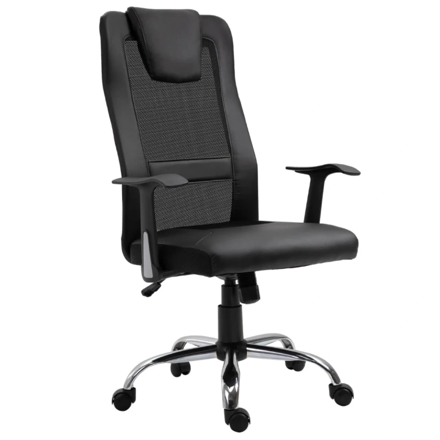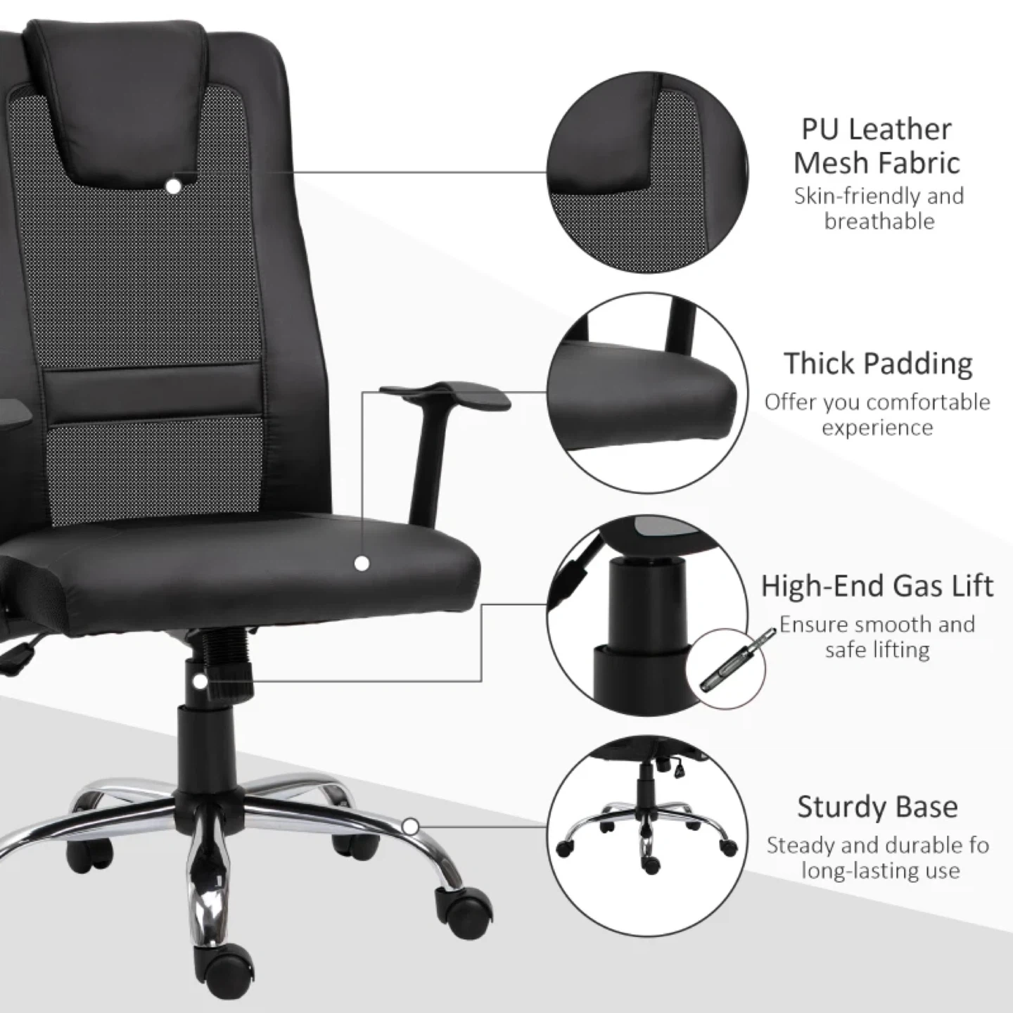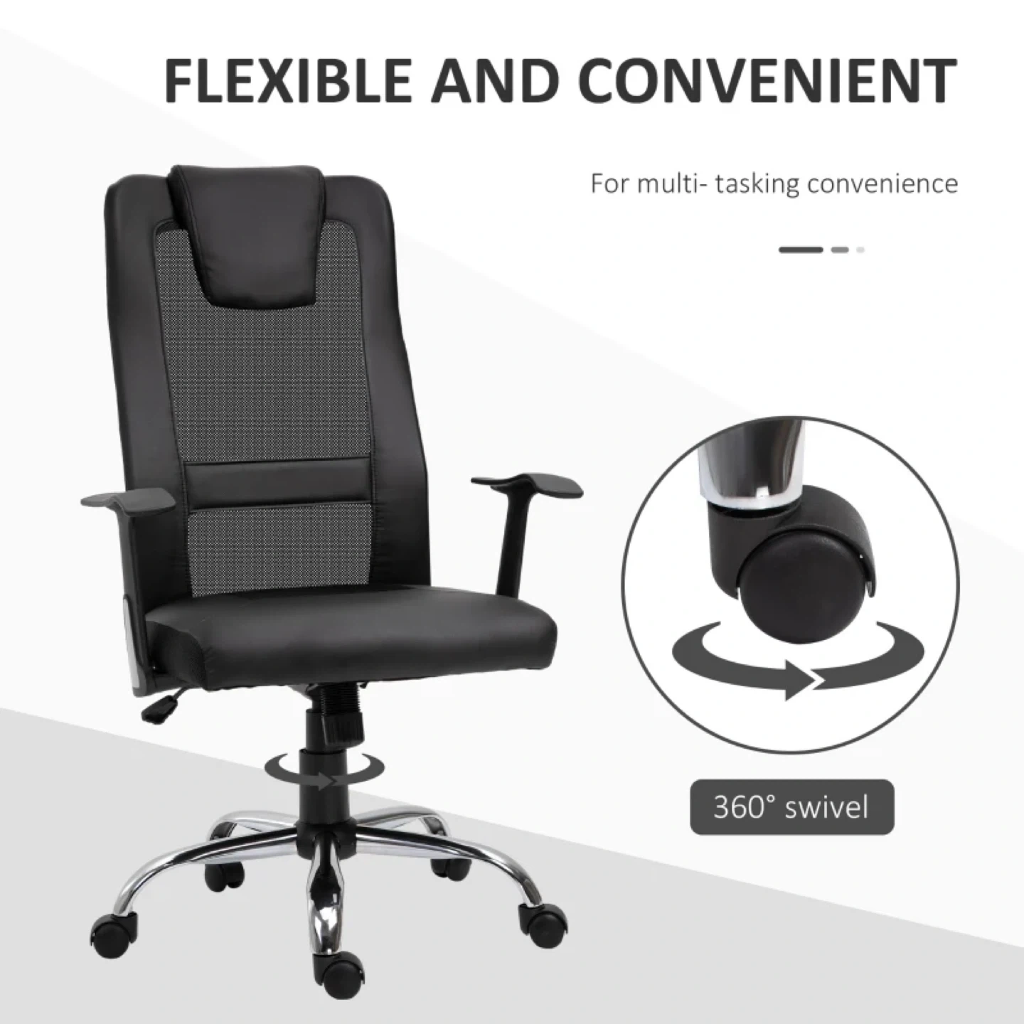 This black office chair is designed for multi-tasking convenience. It features a 360° swivel, a rocking function with adjustable tension, and a high-end gas lift for smooth and safe height adjustments. The chair is made with PU leather and breathable mesh fabric, along with thick padding for a comfortable experience. The sturdy base ensures steady and durable long-lasting use