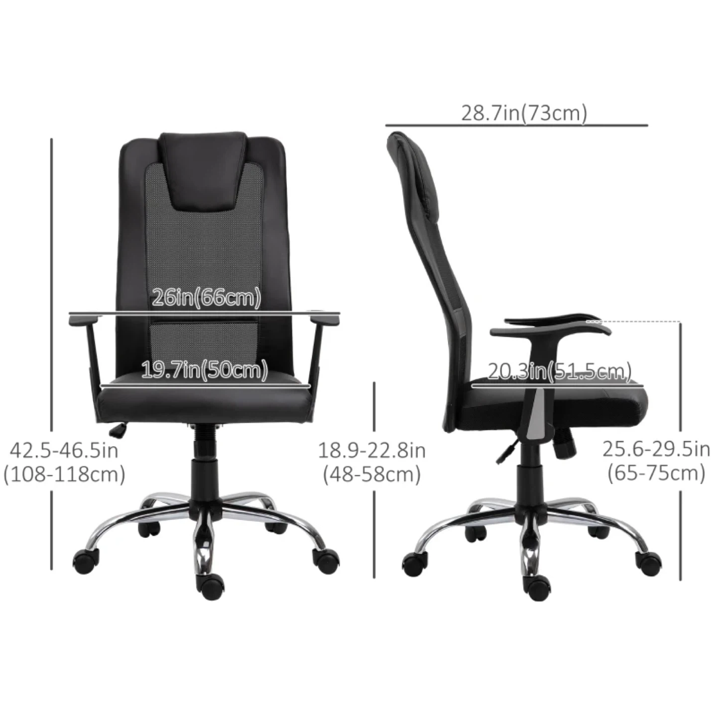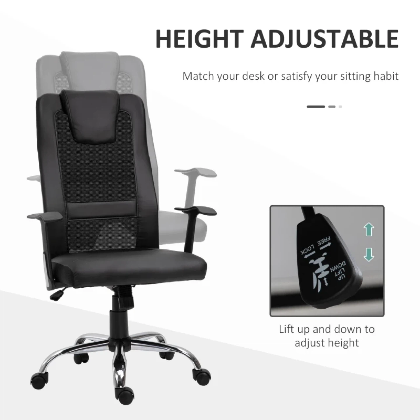 This black office chair is designed for multi-tasking convenience. It features a 360° swivel, a rocking function with adjustable tension, and a high-end gas lift for smooth and safe height adjustments. The chair is made with PU leather and breathable mesh fabric, along with thick padding for a comfortable experience. The sturdy base ensures steady and durable long-lasting use