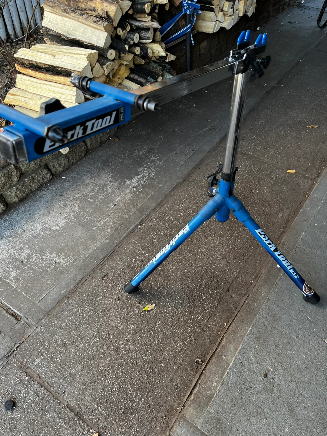 Park Tool PRS-20 Professional Bike Repair Stand. Blue and silver construction. This stand's adjustable height and clamp make bike maintenance easier.