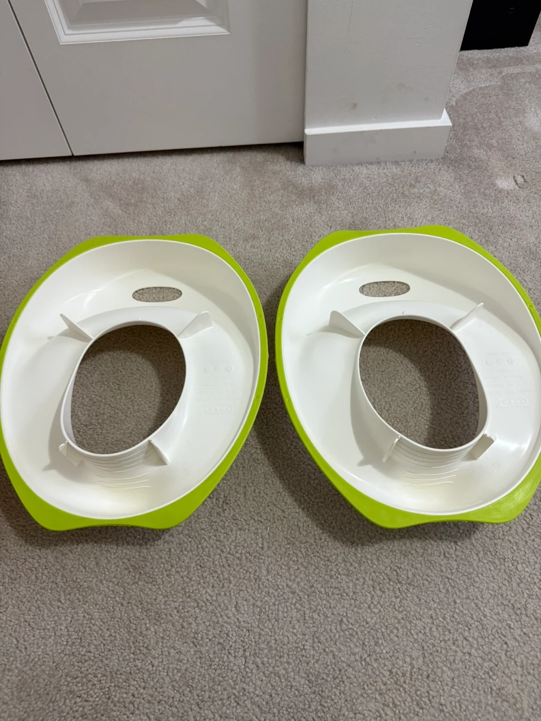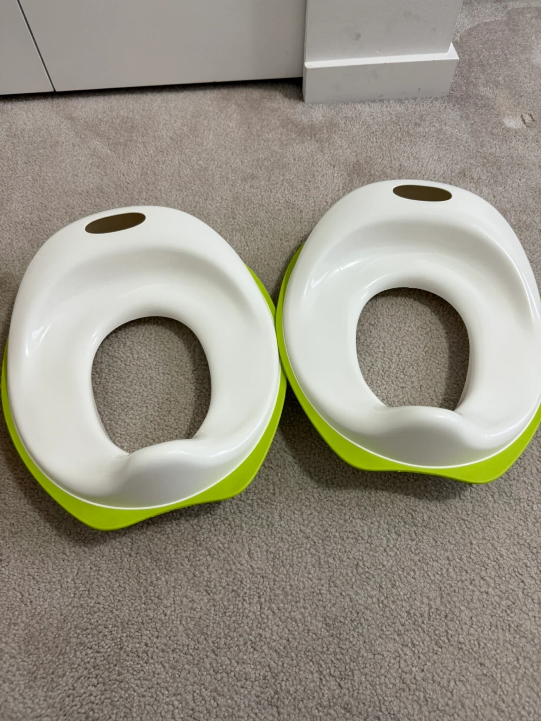 Two white and lime green potty training seats. These are designed for easy potty training for little ones. They're made of durable plastic and fit standard toilets.