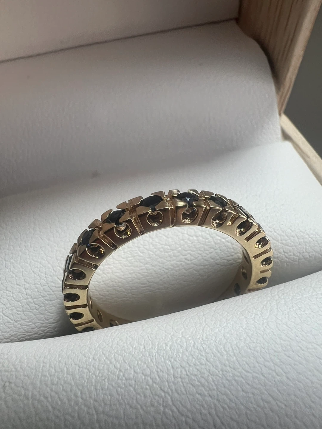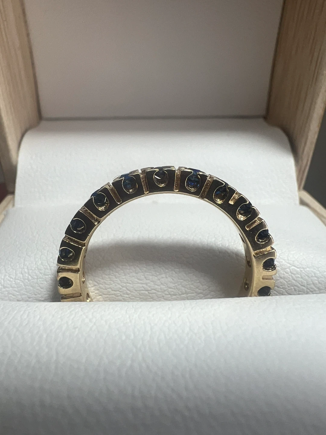 Full eternity ring featuring 20 round sapphires set in 10K yellow gold. It's a custom-made piece with a high polish finish. Size is 6-6.5