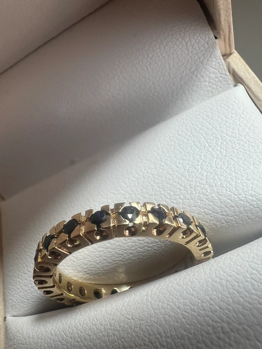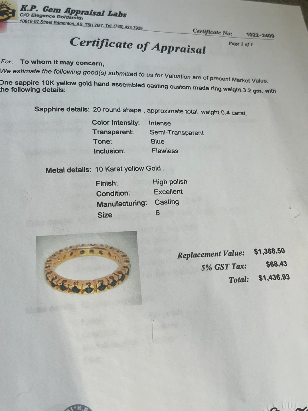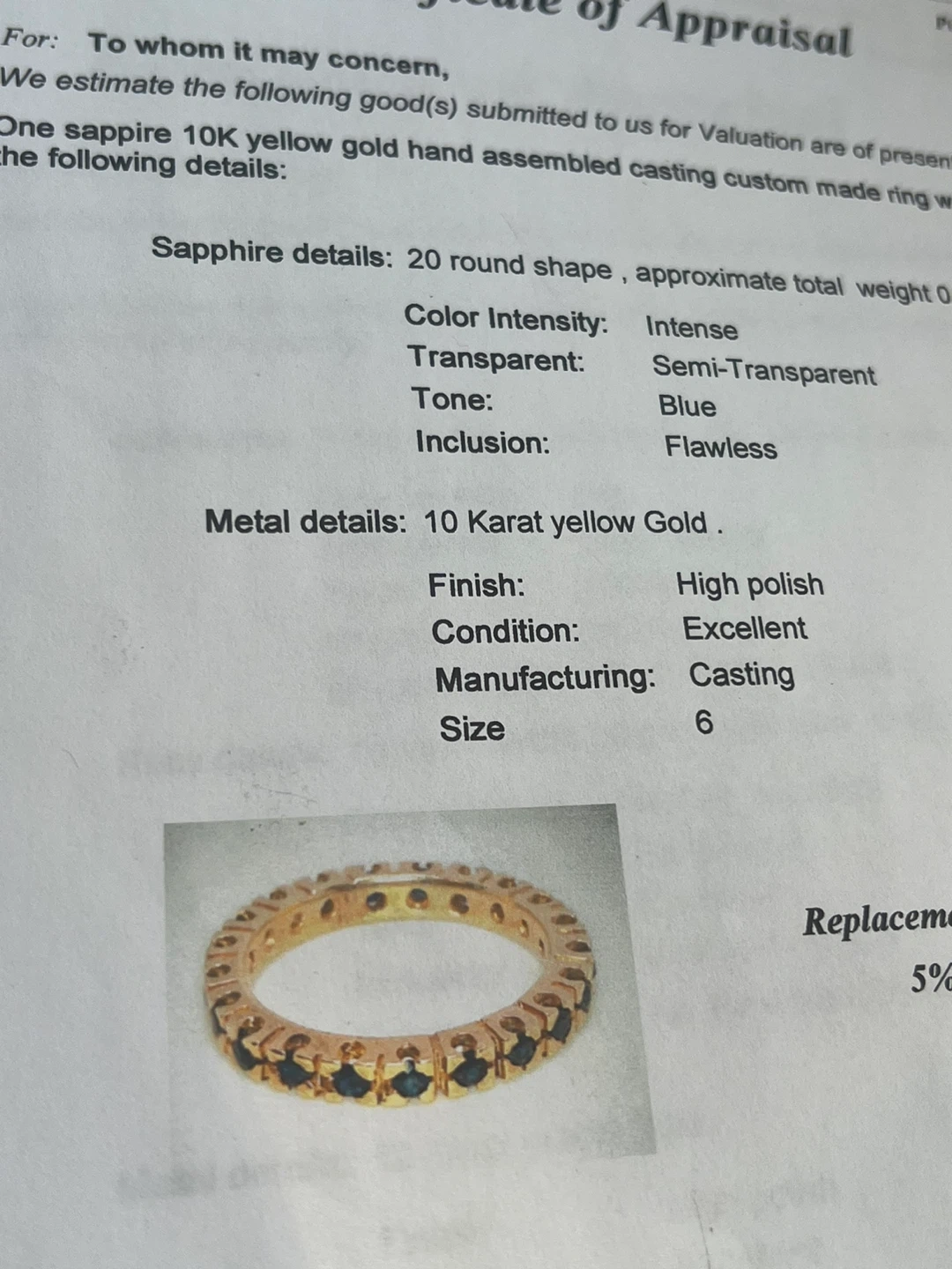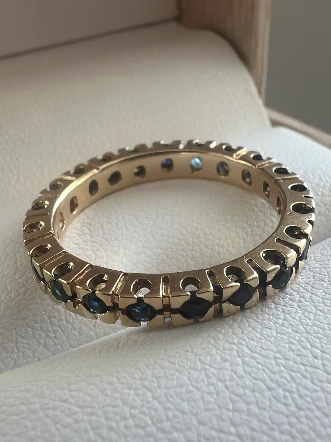 Full eternity ring featuring 20 round sapphires set in 10K yellow gold. It's a custom-made piece with a high polish finish. Size is 6-6.5