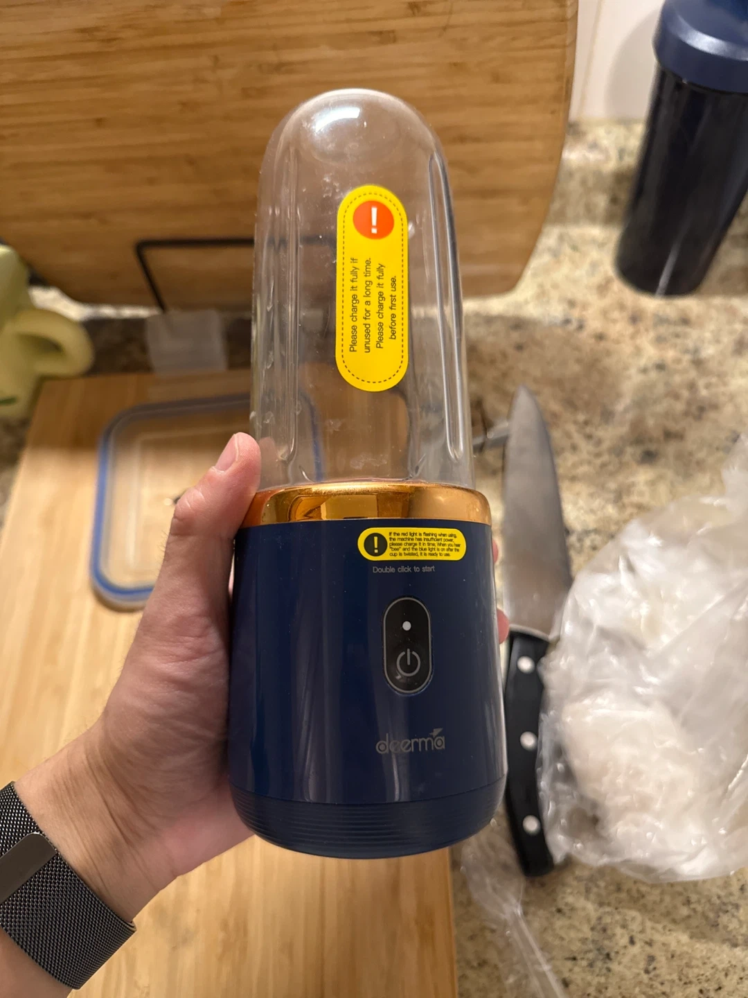 Deerma portable blender, model DEM-JR02. It has a 1500mAh battery capacity and a 400ml capacity. Double click to start! Perfect for making smoothies on the go.