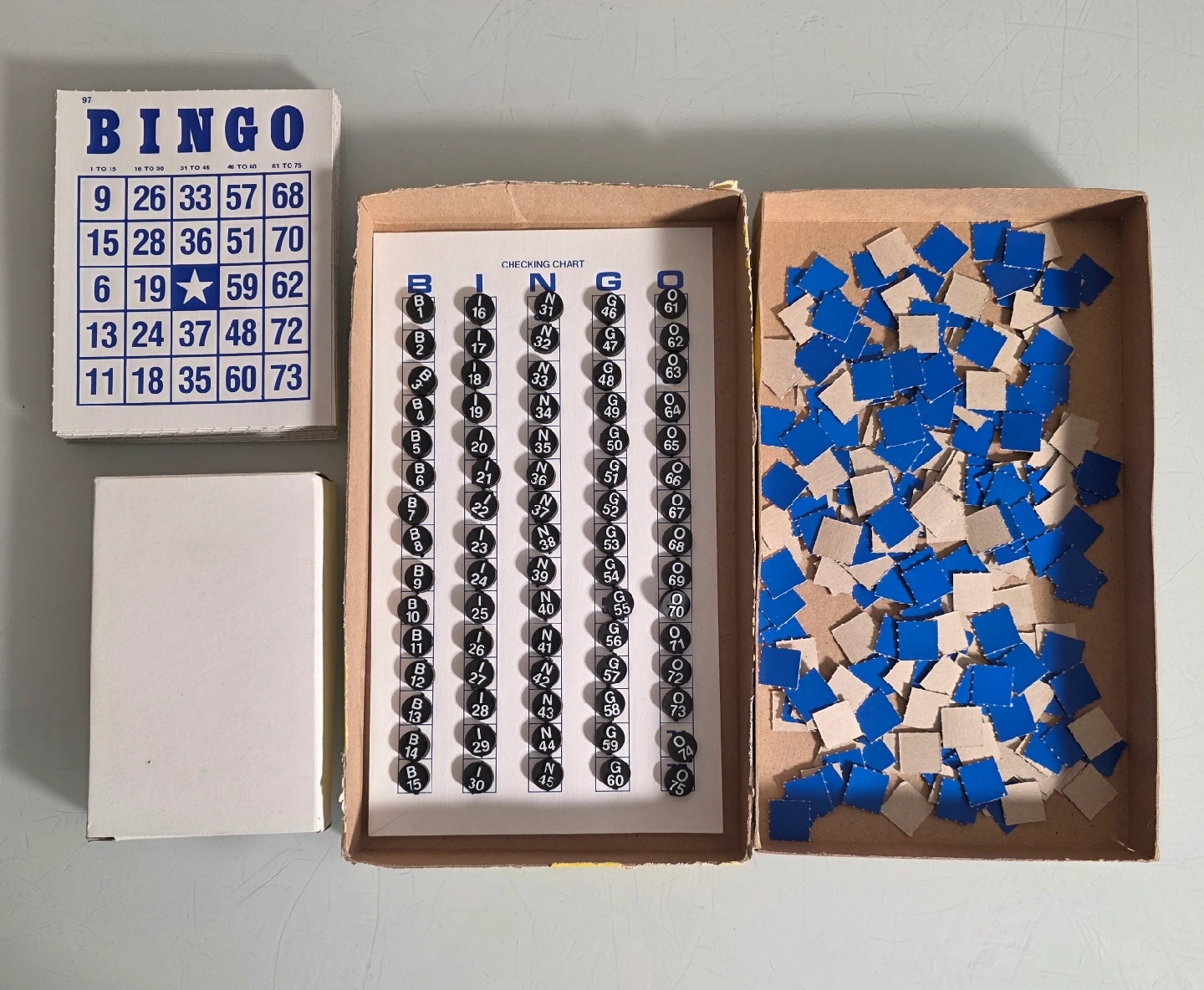 Selling a complete vintage Golden Bingo game. Includes 25 bingo cards, plastic call numbers, markers, checking chart, dispenser, and instruction sheet. A classic game for up to 25 players, ages 7 to adult. Great condition. Completely unused.