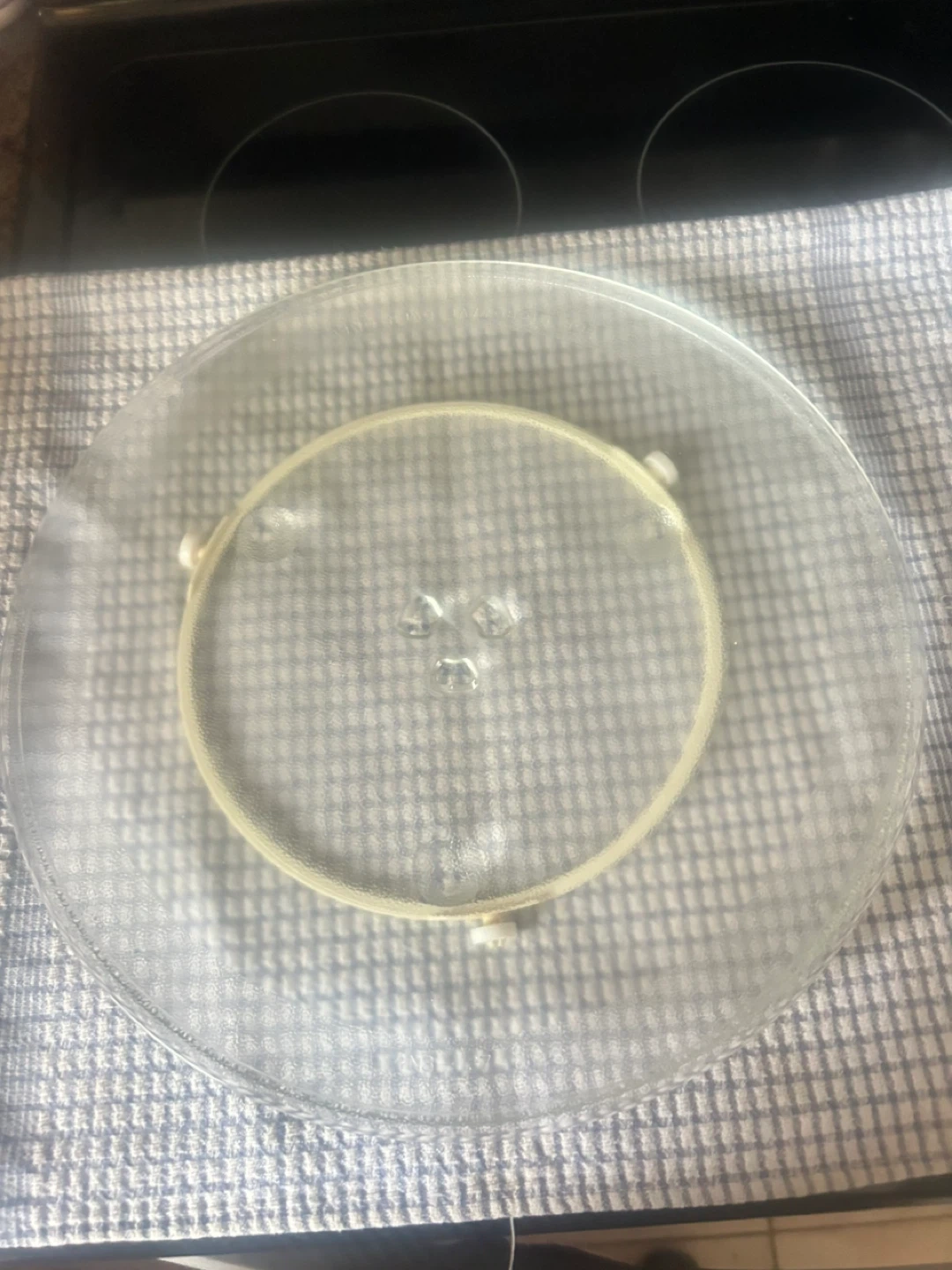 A clear glass turntable plate for microwave.