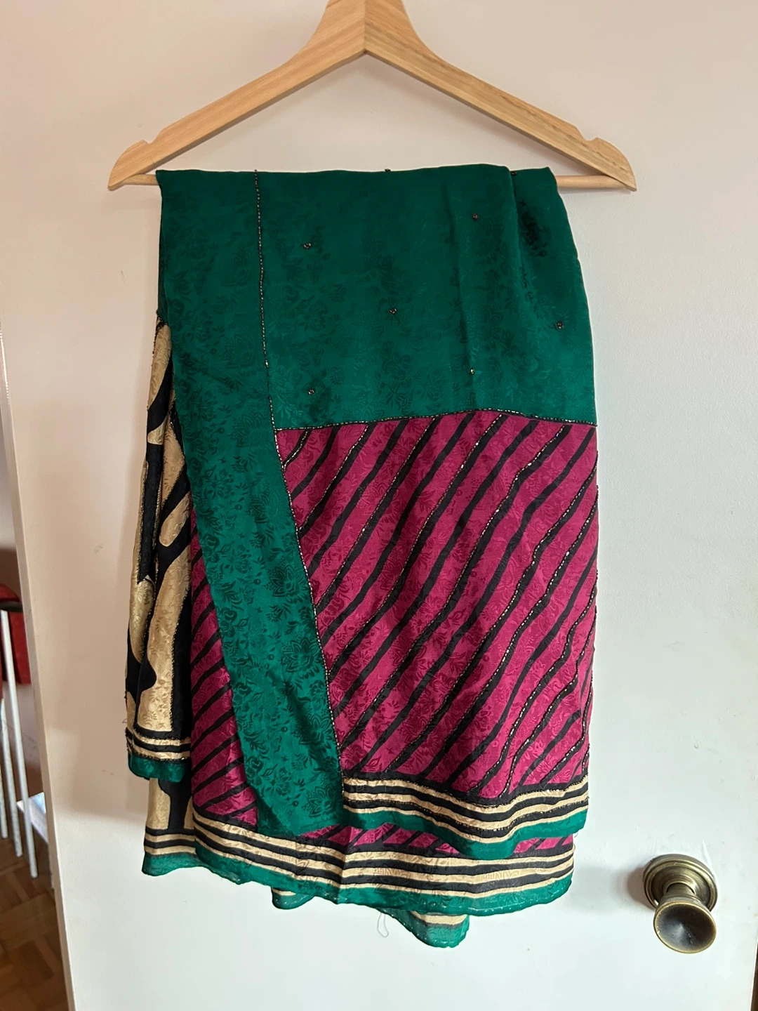 Beautiful saree with a mix of vibrant colours. It features a rich green fabric with an embossed pattern, a striking magenta section with black stripes, and a gold and black animal print border. Light tissue like material. Embellished with subtle beadwork throughout. Perfect for special occasions!