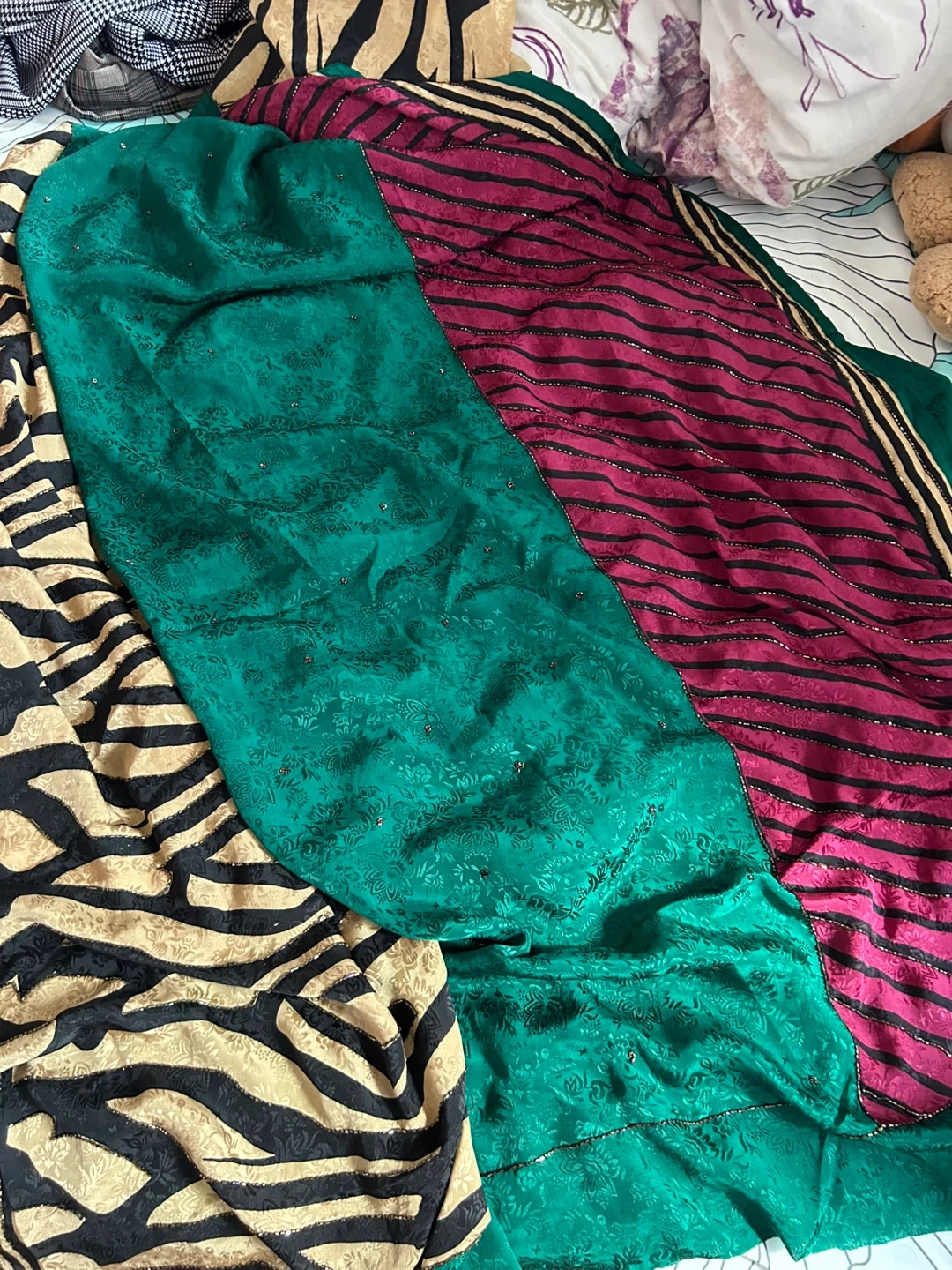 Beautiful saree with a mix of vibrant colours. It features a rich green fabric with an embossed pattern, a striking magenta section with black stripes, and a gold and black animal print border. Light tissue like material. Embellished with subtle beadwork throughout. Perfect for special occasions!