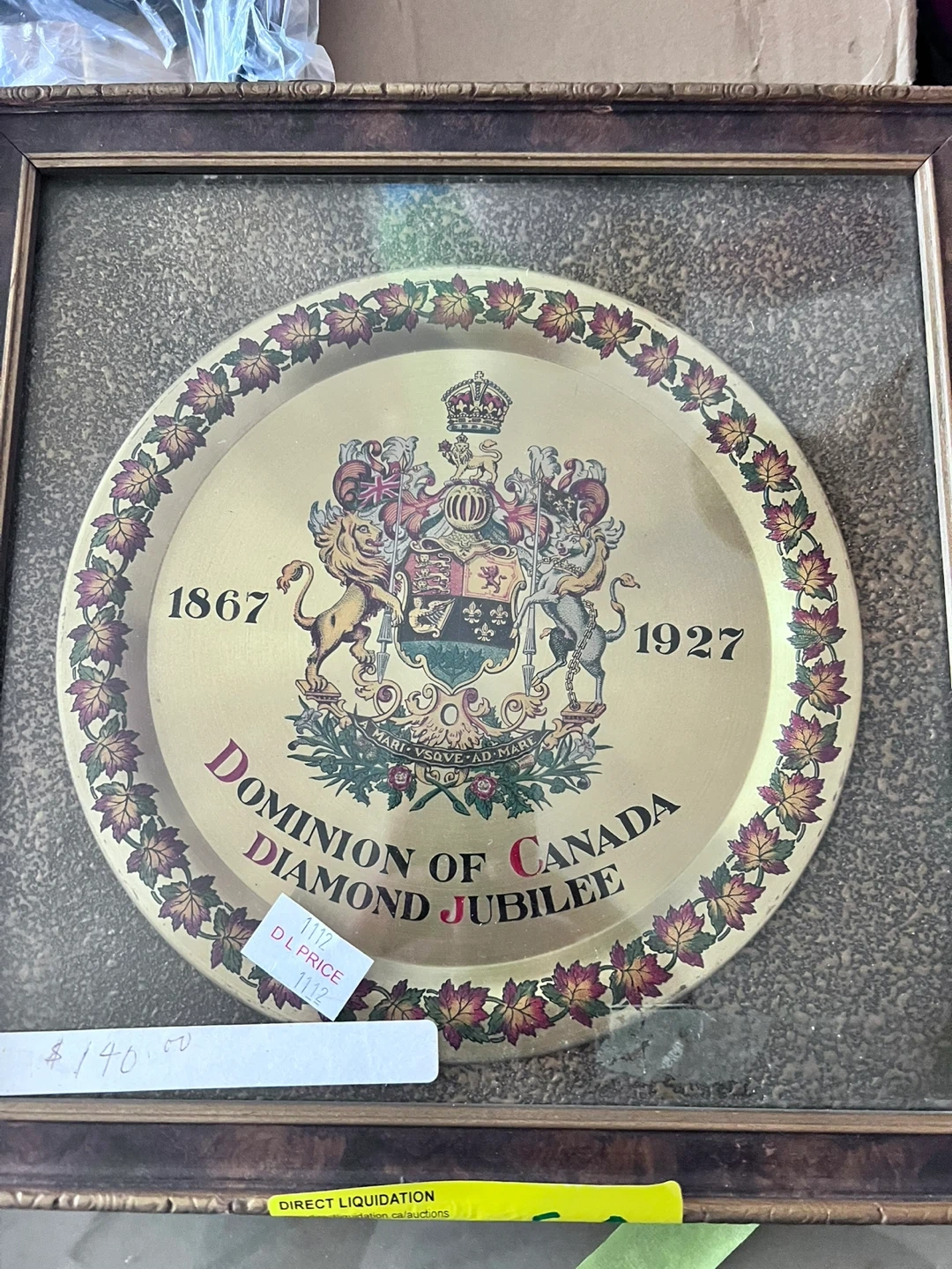 Commemorative tray celebrating the Diamond Jubilee of the Dominion of Canada. Features the Royal Coat of Arms. Dates 1867 and 1927 are displayed. This piece would be a great addition for collectors of Canadian memorabilia.