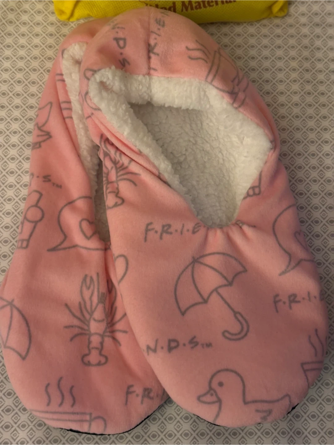 Cozy pink slippers featuring iconic Friends TV show symbols like the lobster and umbrellas. They're lined with soft sherpa for extra warmth. Perfect for lounging at home!