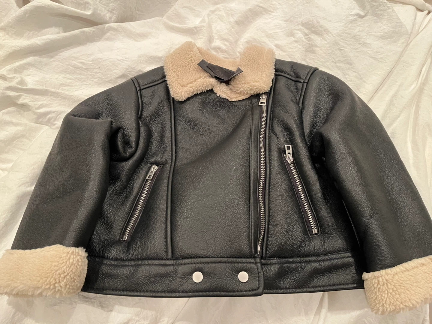 Zara kids black faux leather jacket, perfect for keeping your little one warm and stylish! The jacket features a soft, cozy lining and a cool, classic design. Size is 5t