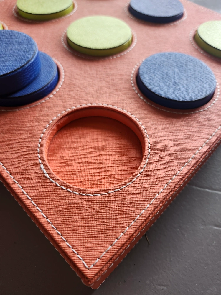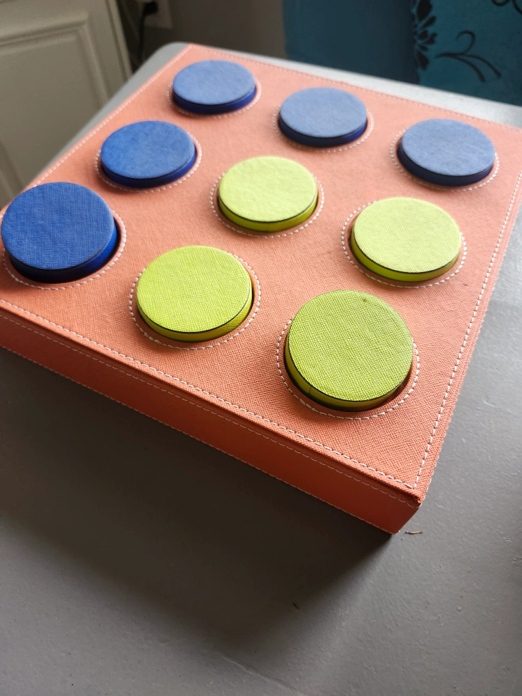 Here's a cute decorative X & O game. Mint condition 11x 11 x 2-1/2" thick Like a vinyl Makes a great decor price and adds a pop of color. Great for travelling or camping