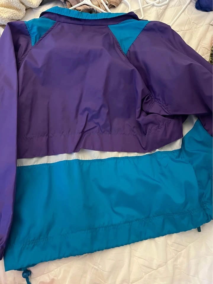 Very loved vintage windbreaker from bodyline by brooks. Lightweight and size large. Has adjustment strings on bottom, pockets, and zipper works well.