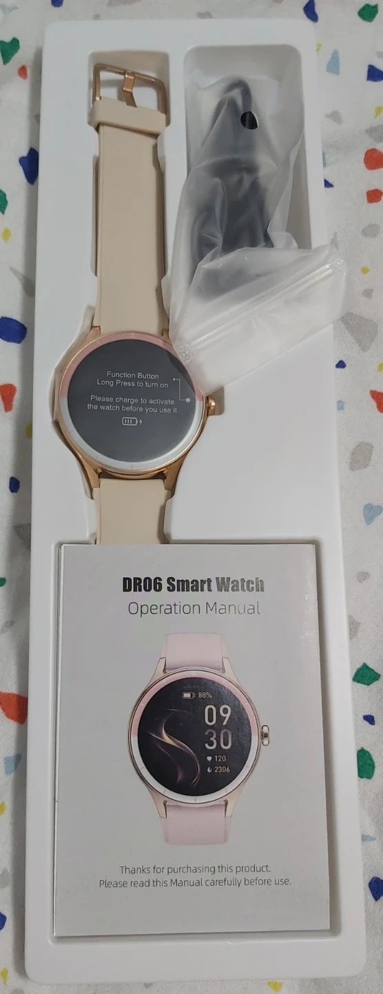Smart Watch for Women, iPhone & Android Compatible - Smart Watch with a rose gold casing and pink band. Includes charging cable and operation manual. Please charge to activate the watch before you use it.