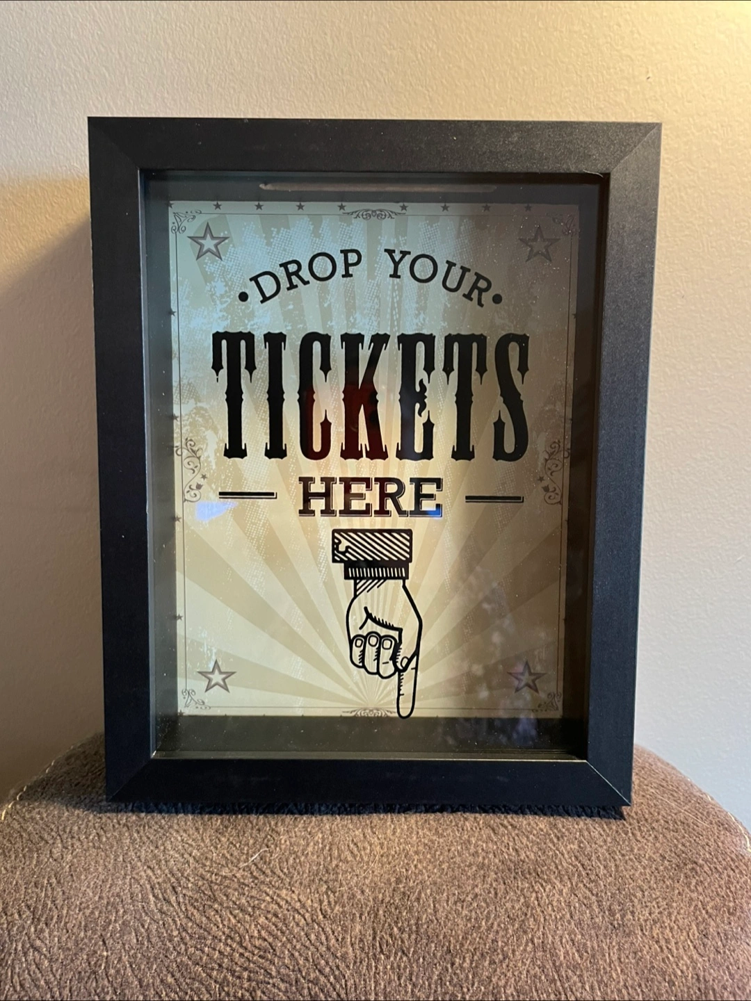 64Black framed shadow box. Features a vintage-style design. Says "Drop your tickets here". Perfect for organizing tickets or as a decorative piece.