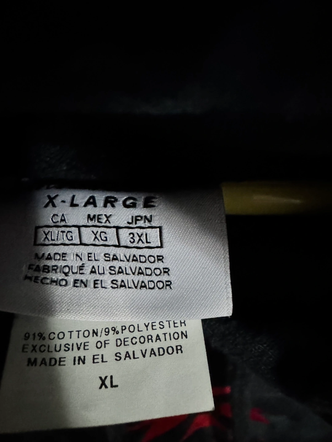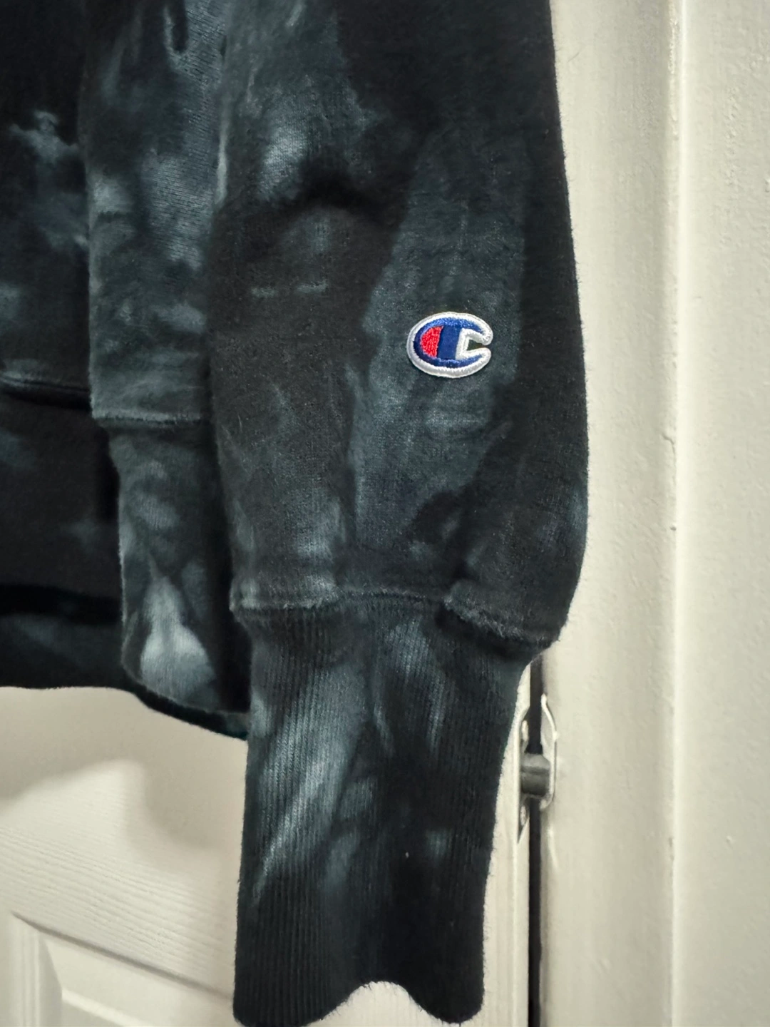 Men's Champion tie-dye hoodie. Size XL. Features embroidered ERRA logo. Made in El Salvador. 91% cotton, 9% polyester.