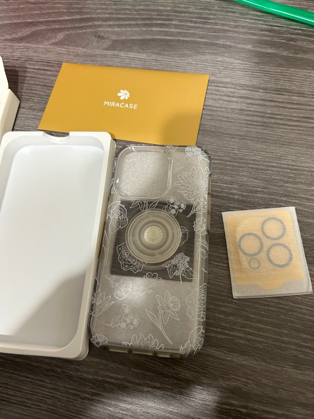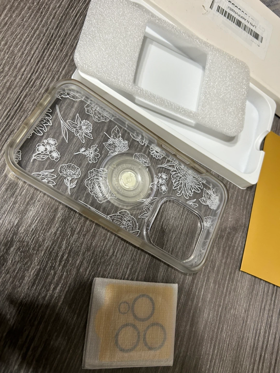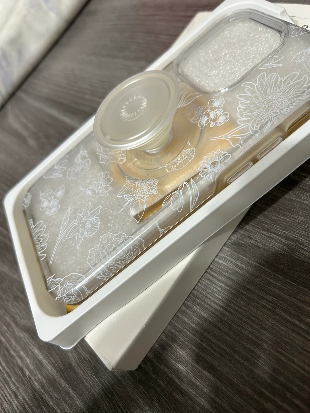 This new clear phone case features a delicate floral design and an integrated grip. It's made from durable material and includes a lens protector. It comes in its original packaging.