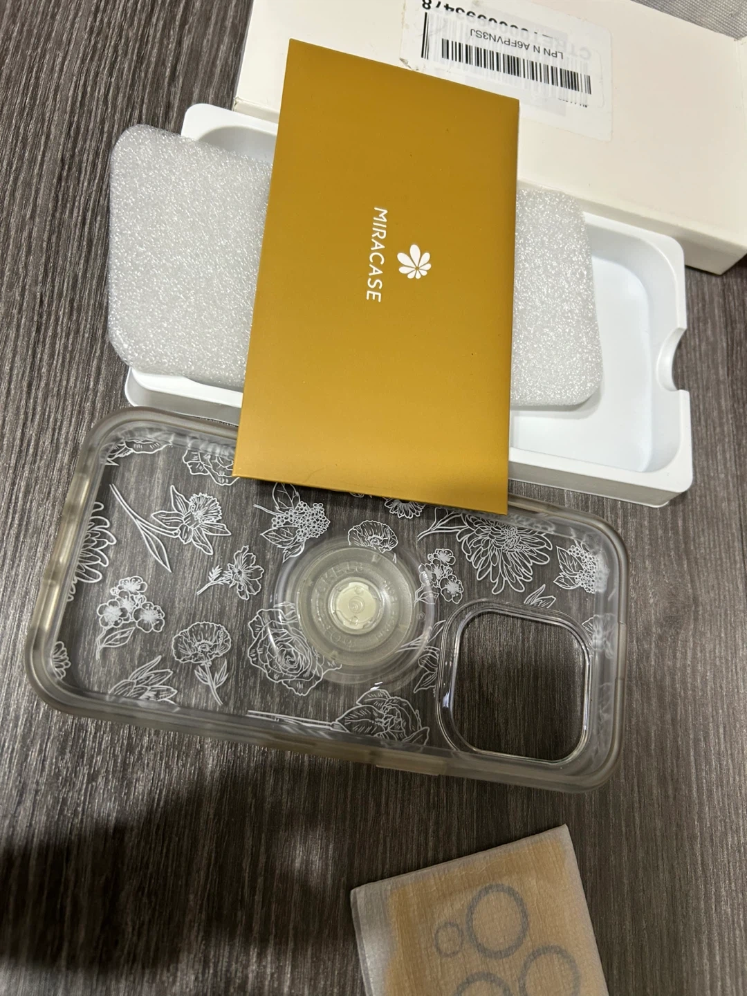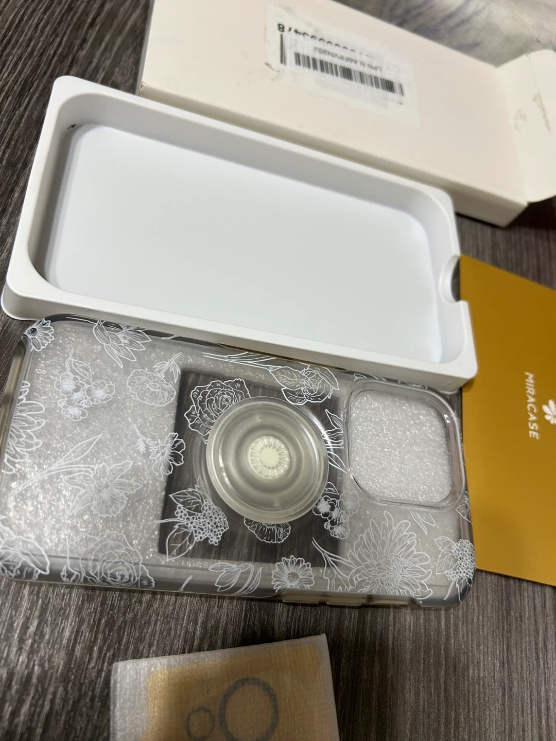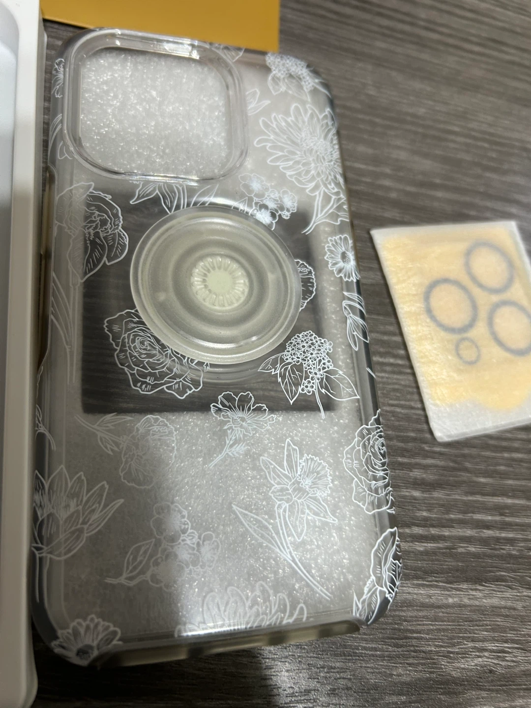 This new clear phone case features a delicate floral design and an integrated grip. It's made from durable material and includes a lens protector. It comes in its original packaging.