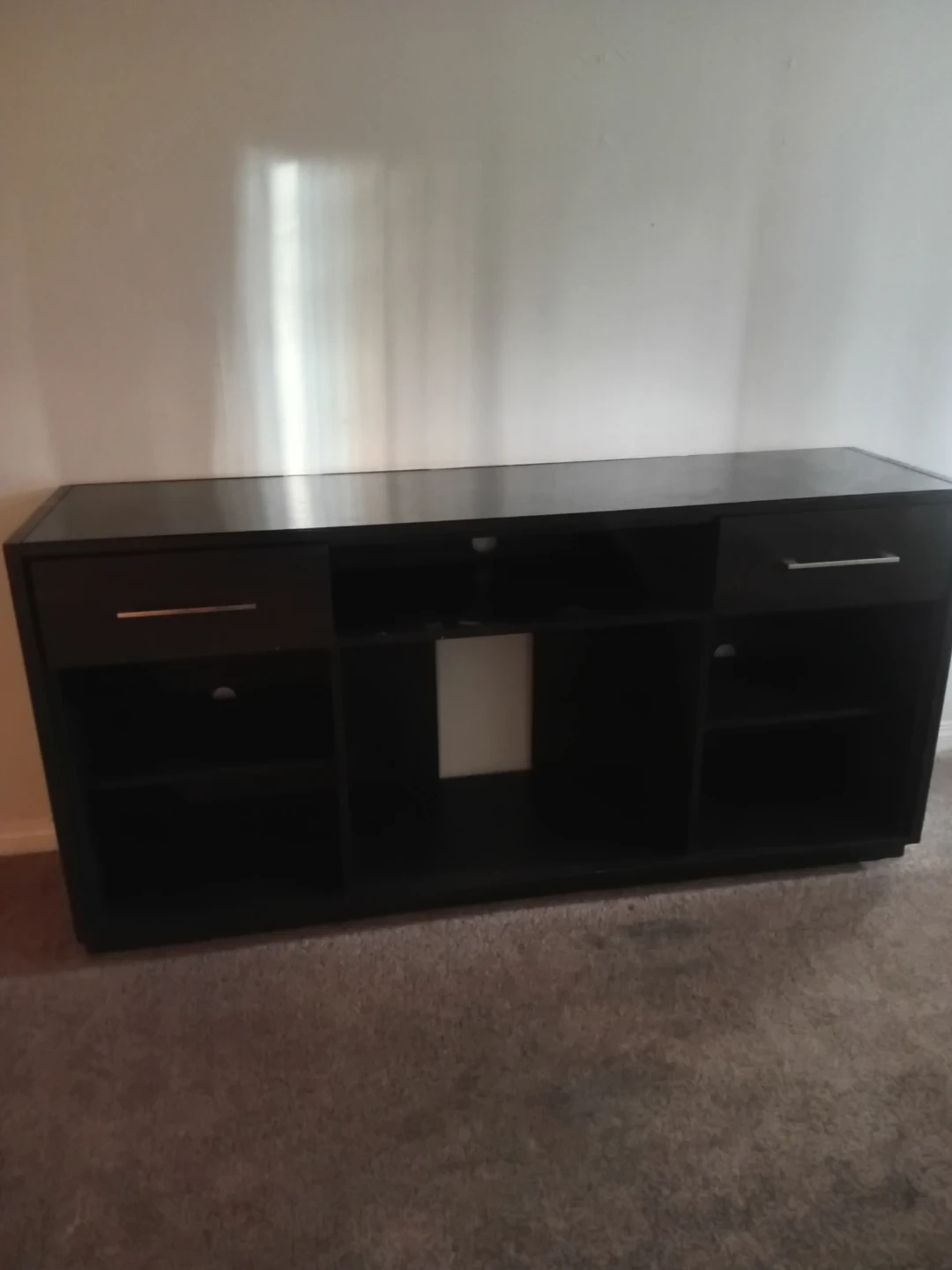 This is a black entertainment unit with two drawers and multiple shelves. It's a sleek design that fits well in most living rooms. The unit offers ample storage space for media devices and accessories.