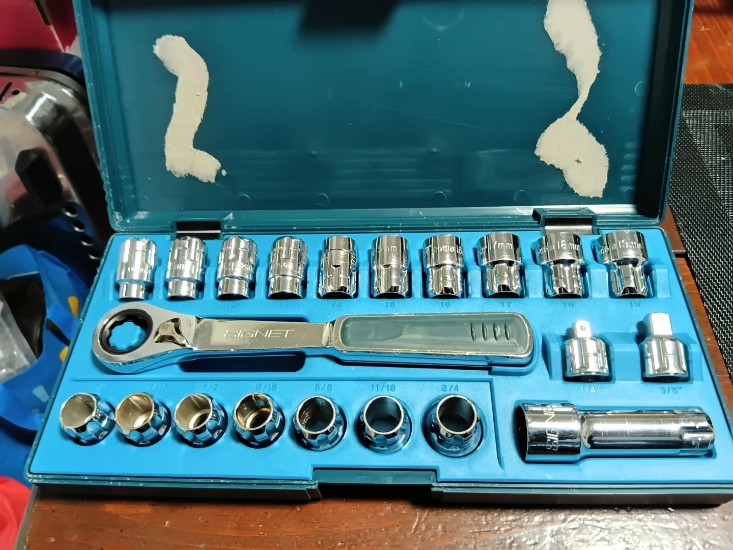 This is a Signet ratchet socket wrench set with a variety of metric and imperial sockets. Includes a ratchet handle and several socket sizes, including 16mm, 17mm, 18mm, 19mm, 7/16", 1/2", 9/16", 5/8", 11/16", 3/4", 1/4", and 3/8". It's all neatly organized in a teal plastic case. This set is handy for various mechanical tasks!