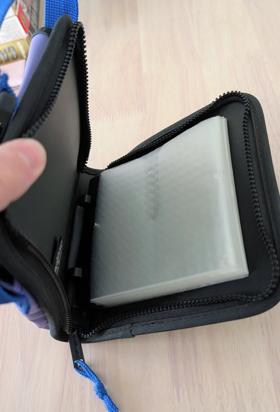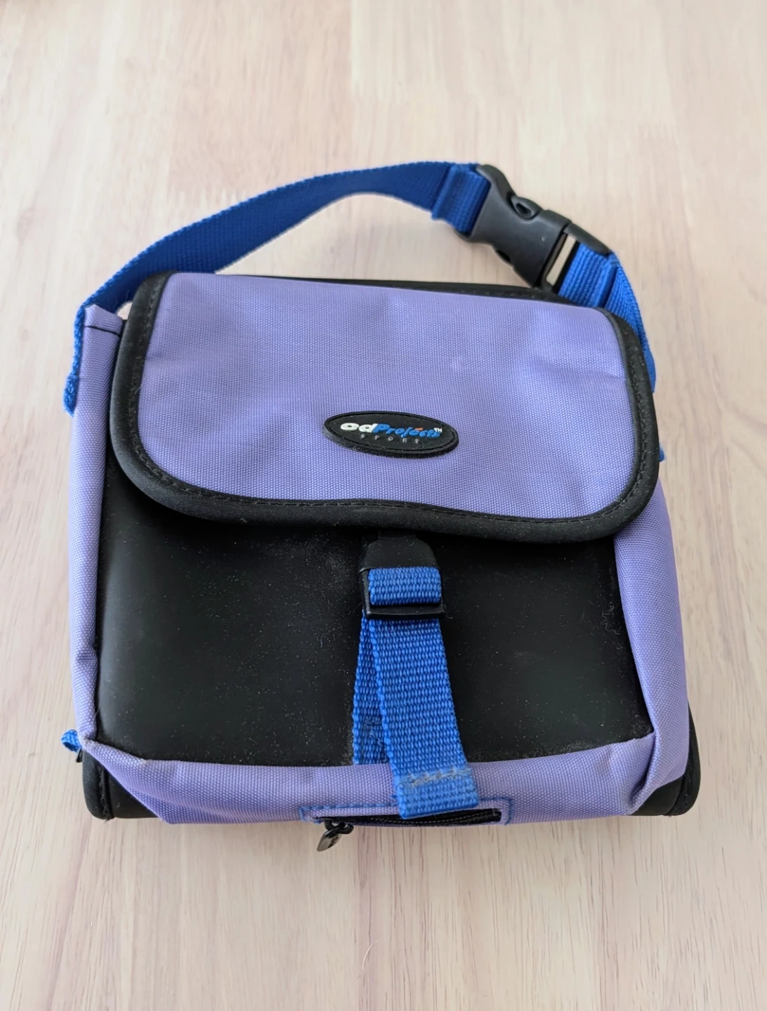 Odyssey zippered wallet case for CDs or DVDs. It's purple and black with a blue strap and buckle closure. Inside, it has clear sleeves to hold your discs.