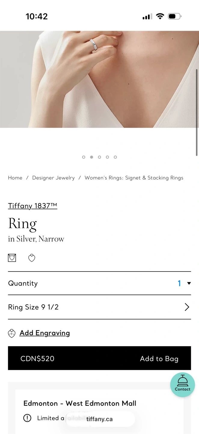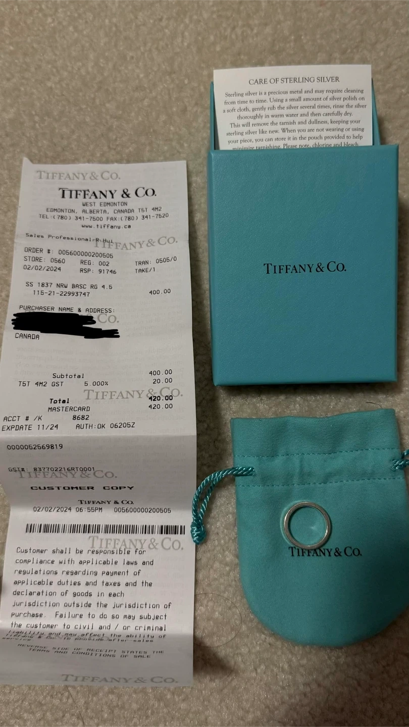Selling a Tiffany & Co. 1837 ring in silver, narrow band. It's a size 4.5. Originally bought for $420. The ring comes with its original box and pouch.