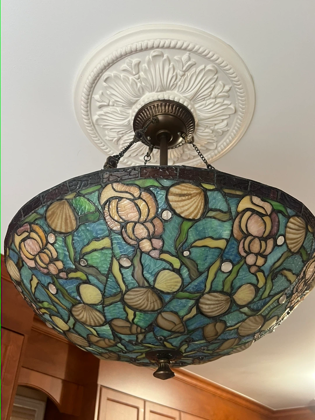 75Selling a beautiful Tiffany style stained glass hanging lamp! It features a lovely floral and seashell design with a mix of blues, greens, and browns. It would be a great addition to any room!