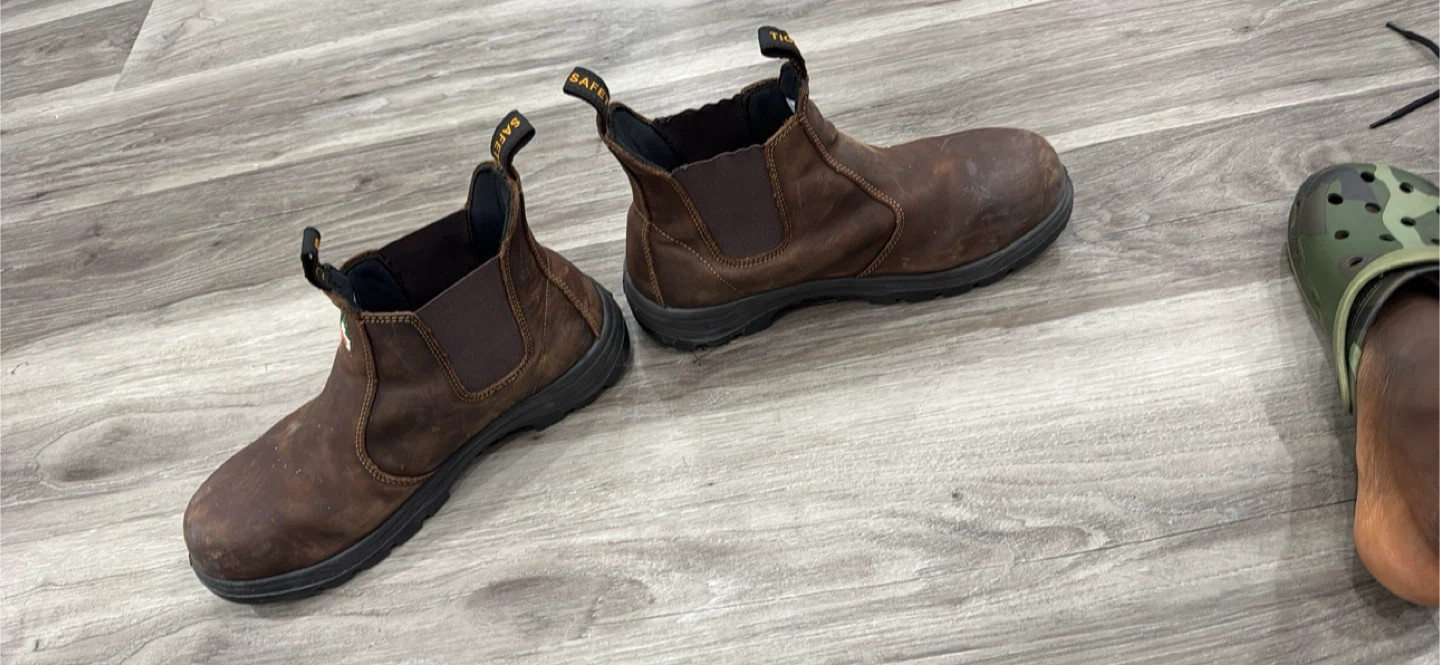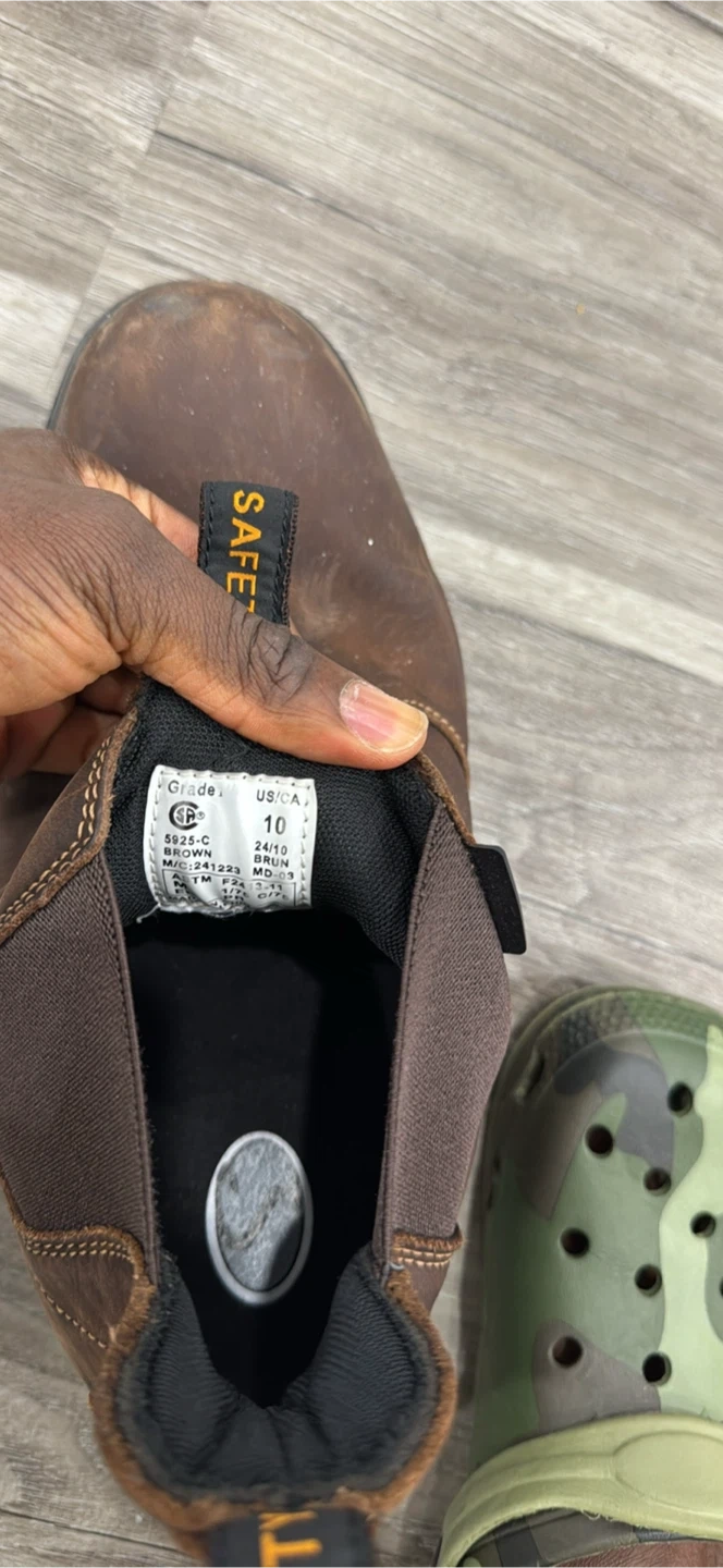 62Selling a pair of Tiger Safety boots in brown leather. They're a size 10 US/CA. These boots have some signs of wear, as you can see in the pictures, but they're still sturdy and ready for work!