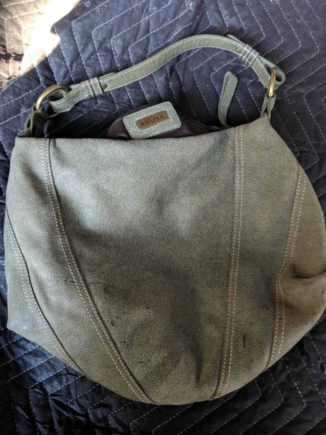 This Danier hobo bag is made of green leather. It has a slouchy, rounded shape with decorative stitching. Minor scuffs and marks are visible on the exterior.