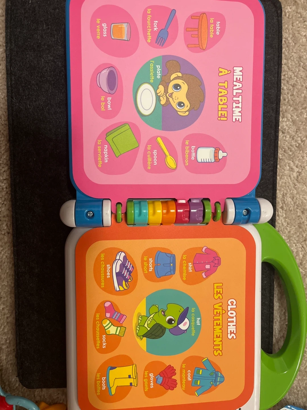 This interactive toy set includes a LeapFrog learning book with colourful pages and a VTech Smart Sounds Baby Keys toy. Both are designed for little ones to explore words, animals, and more. Batteries may be required for full functionality. It's a great way for babies to learn and play!