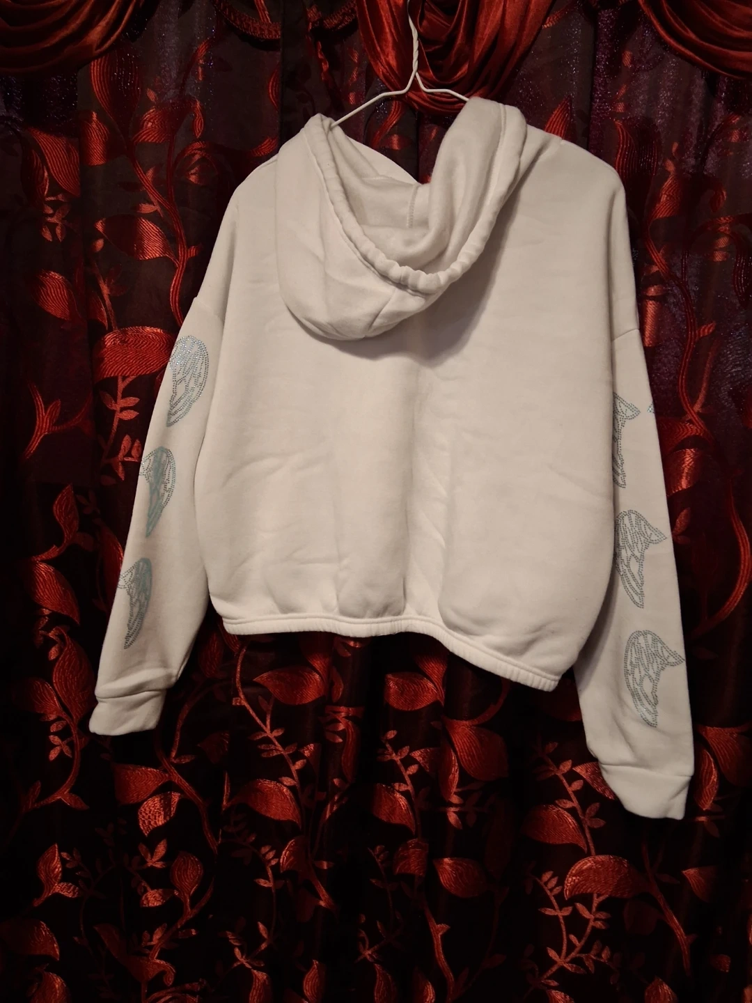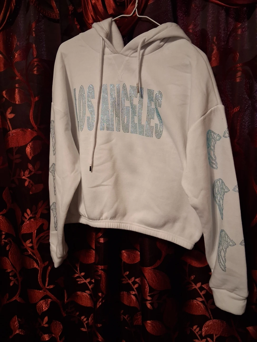 White cropped hoodie with "Los Angeles" text embellished with rhinestones on the front. Wing designs are also on the sleeves. This is a comfortable and stylish hoodie that's perfect for a casual look. It's made from a soft fabric blend.