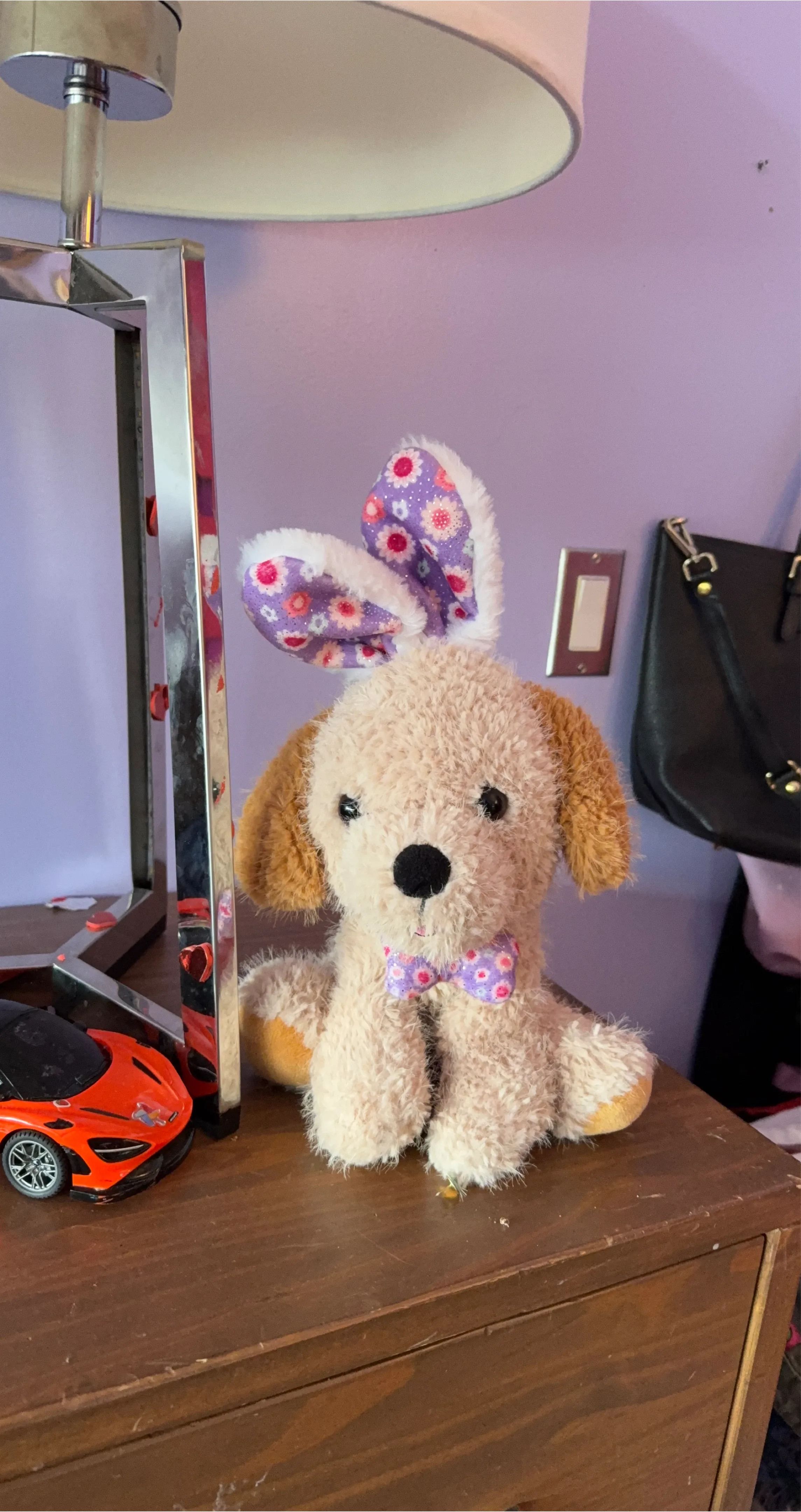 This is a fuzzy plush toy dog with floppy brown ears and bright bunny ears. It's wearing a purple and pink floral bowtie. Perfect for playtime or as a cute decoration!