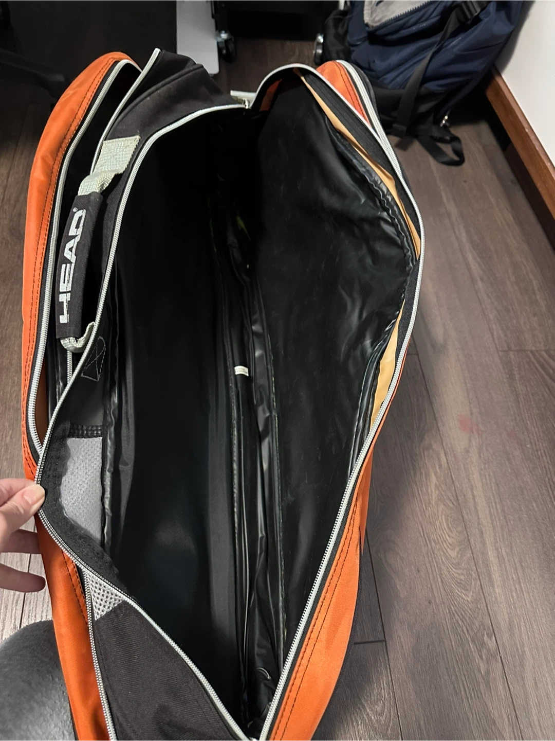 This HEAD tennis bag is designed for carrying your sports gear. It features multiple compartments for organization. The detachable shoulder strap makes it easy to carry. Used condition with some wear and tear signs.