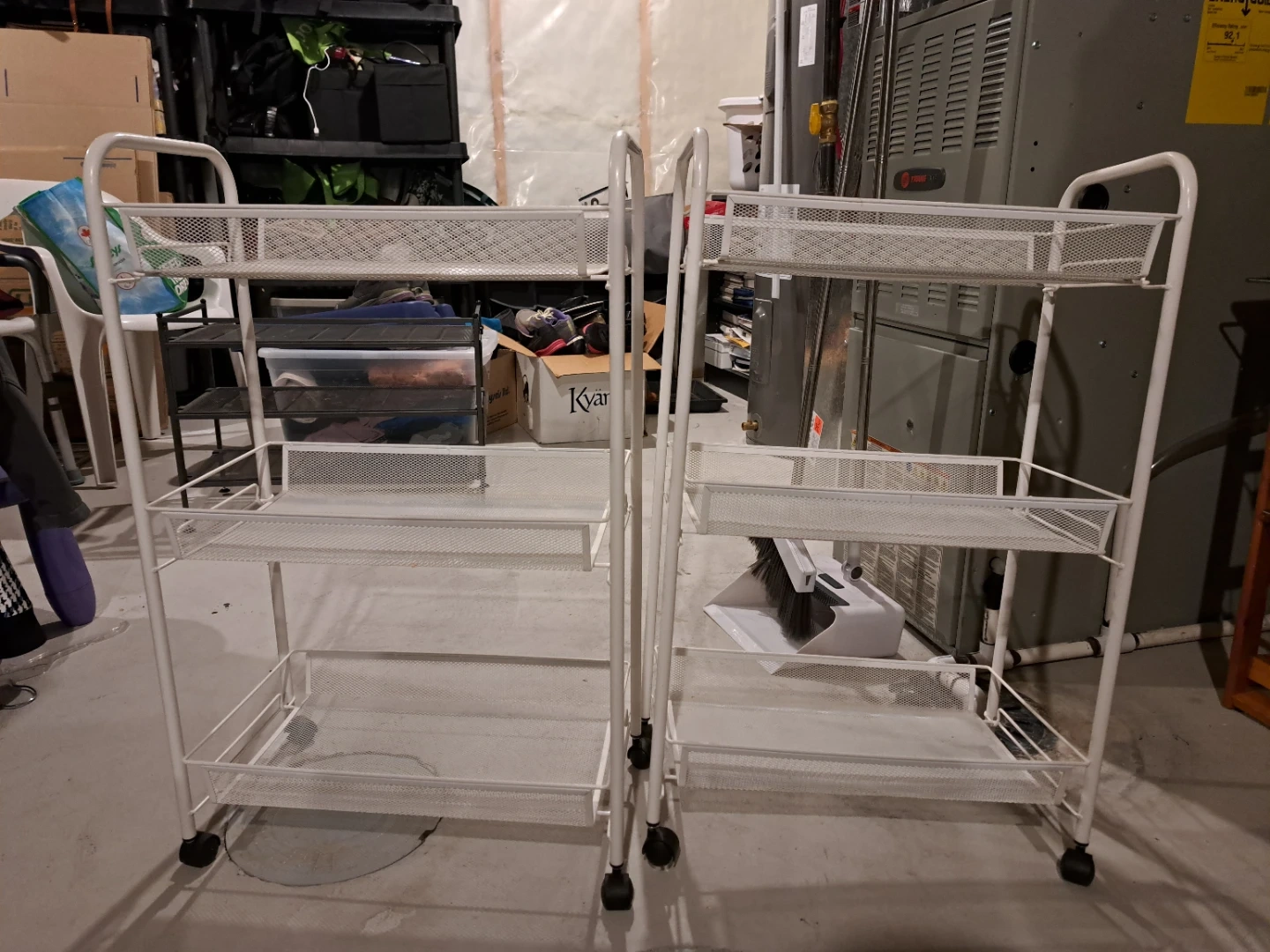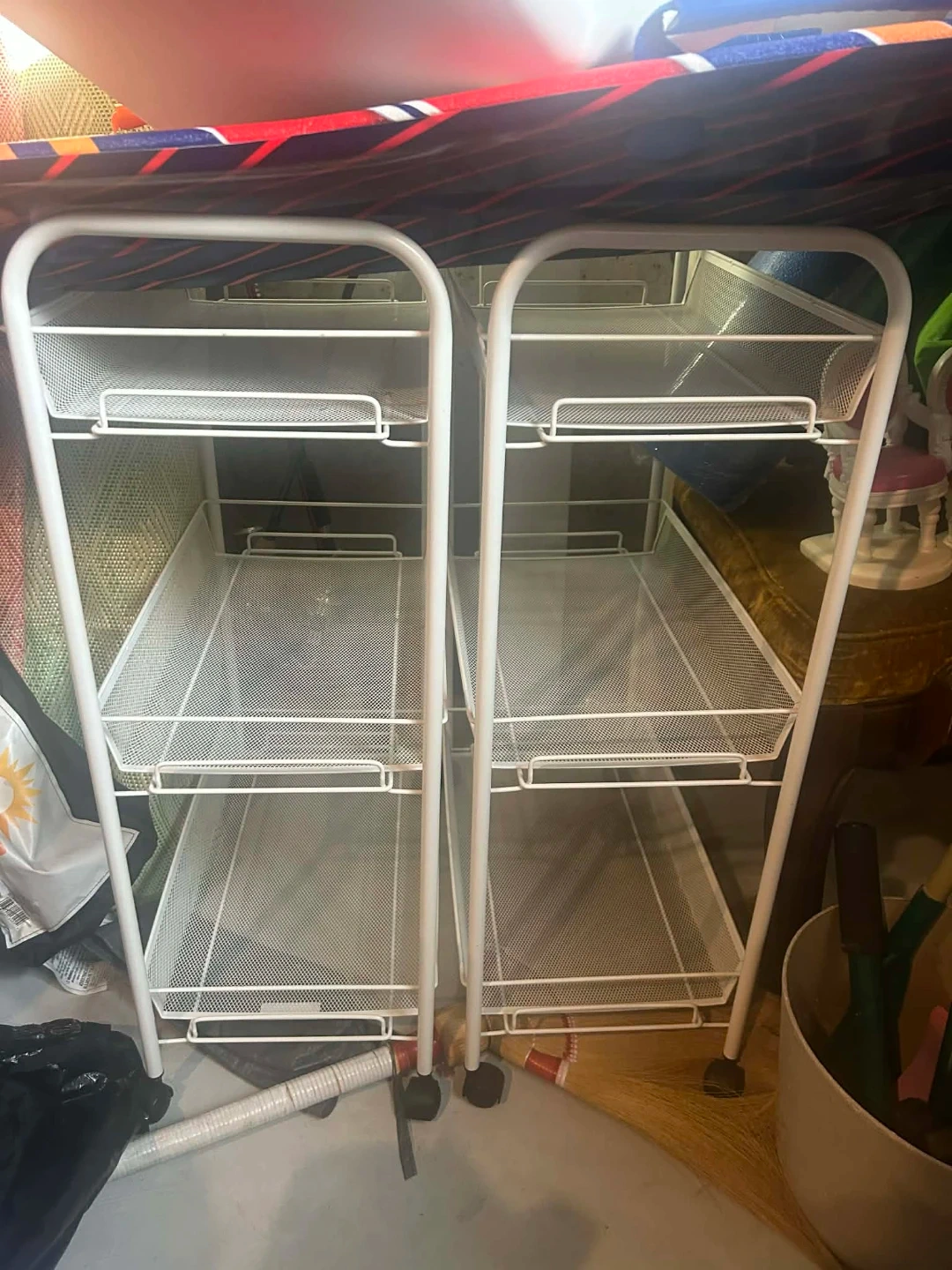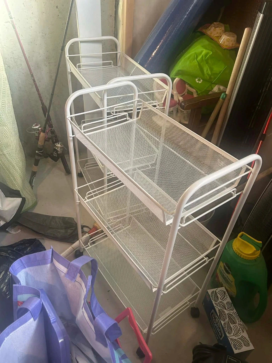 White 3-tier rolling storage cart with mesh shelves. It's made of metal and has casters for easy movement. This cart is great for organizing crafts, kitchen supplies, or bathroom essentials.