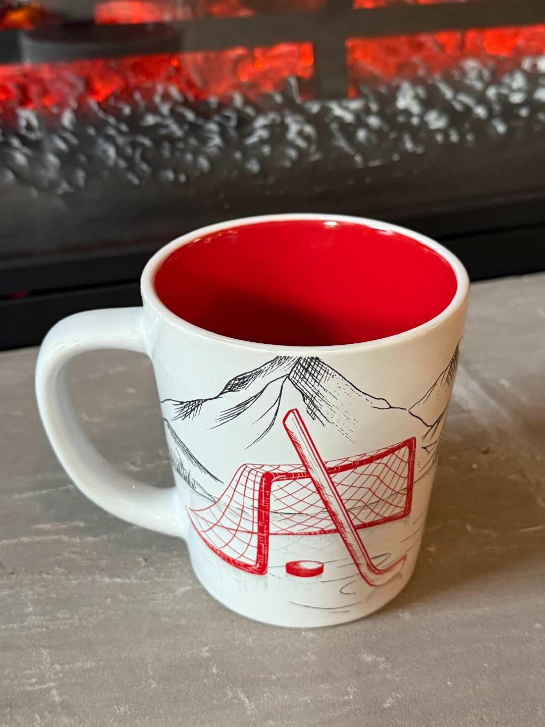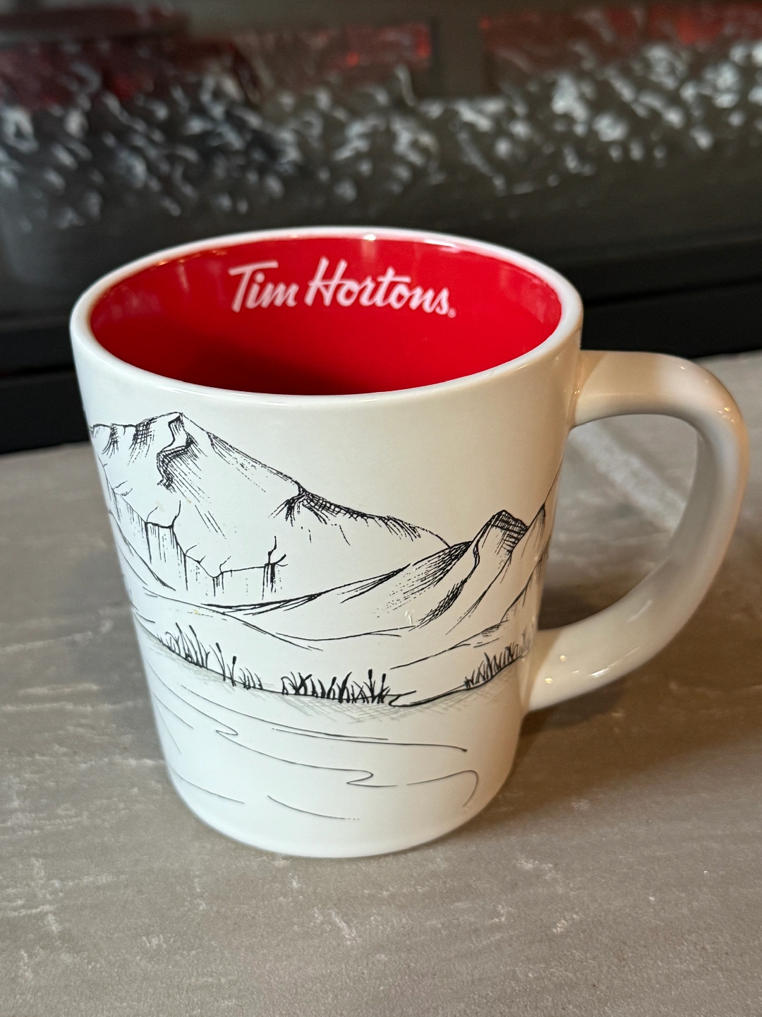 Selling a Tim Hortons mug with a landscape design on one side and a hockey design on the other! The inside of the mug is red.