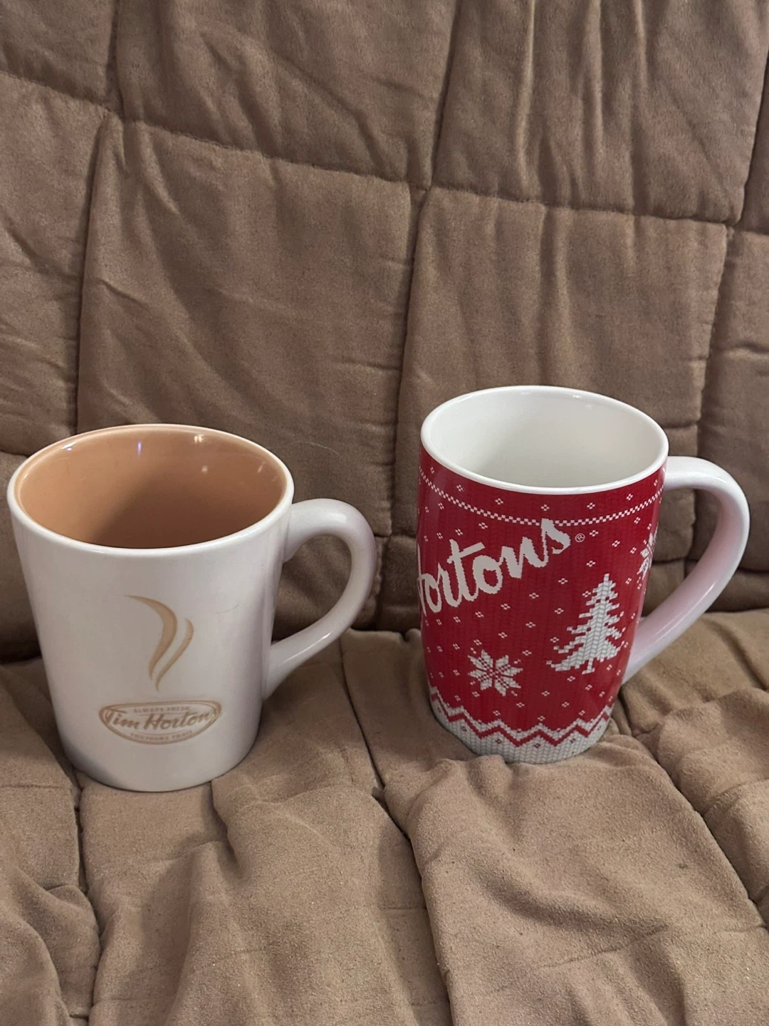 294Selling a set of two Tim Hortons mugs! One is white with the classic Tim Hortons logo, and the other is a festive red and white winter design. Great for enjoying your morning coffee or tea!