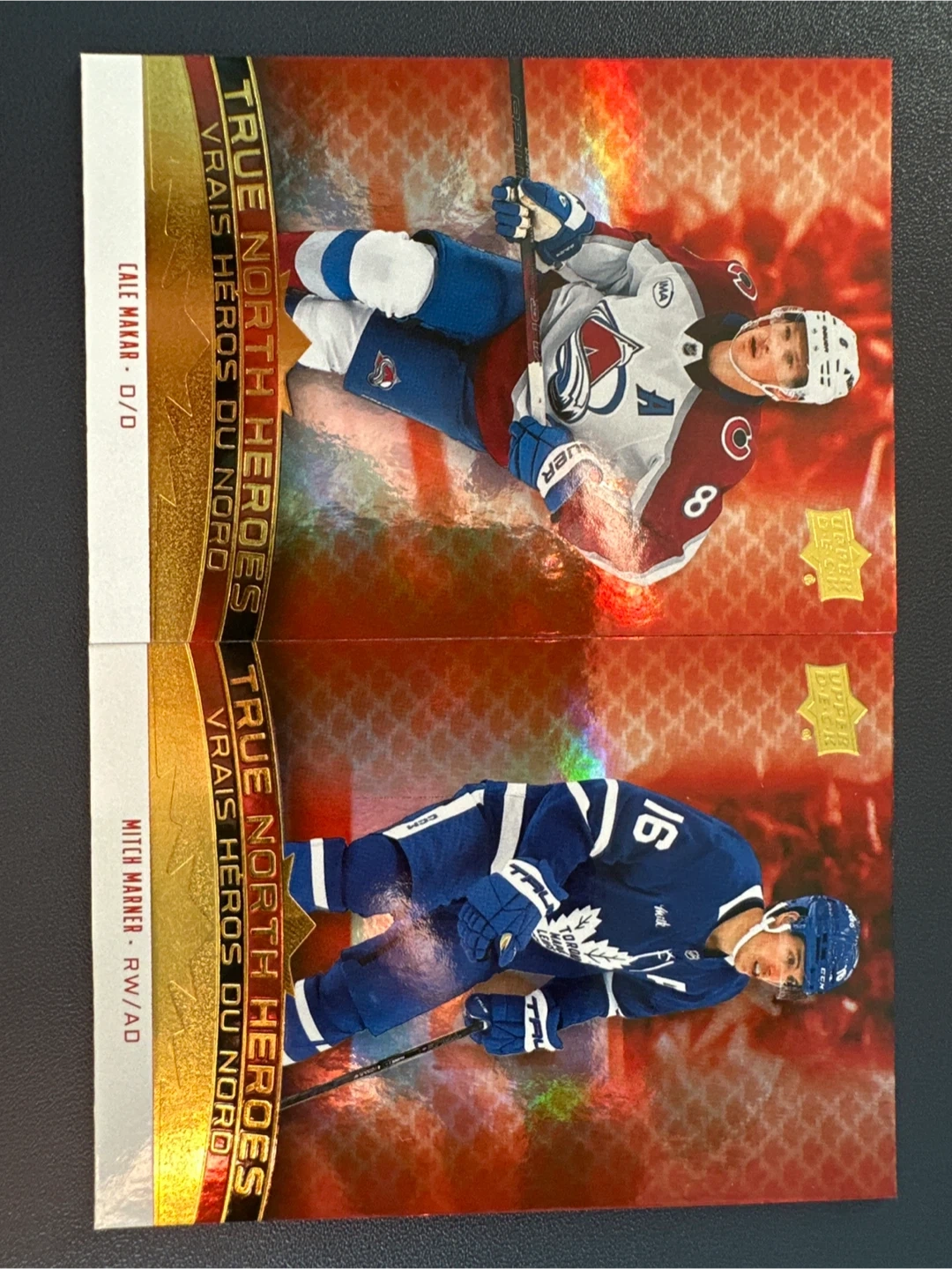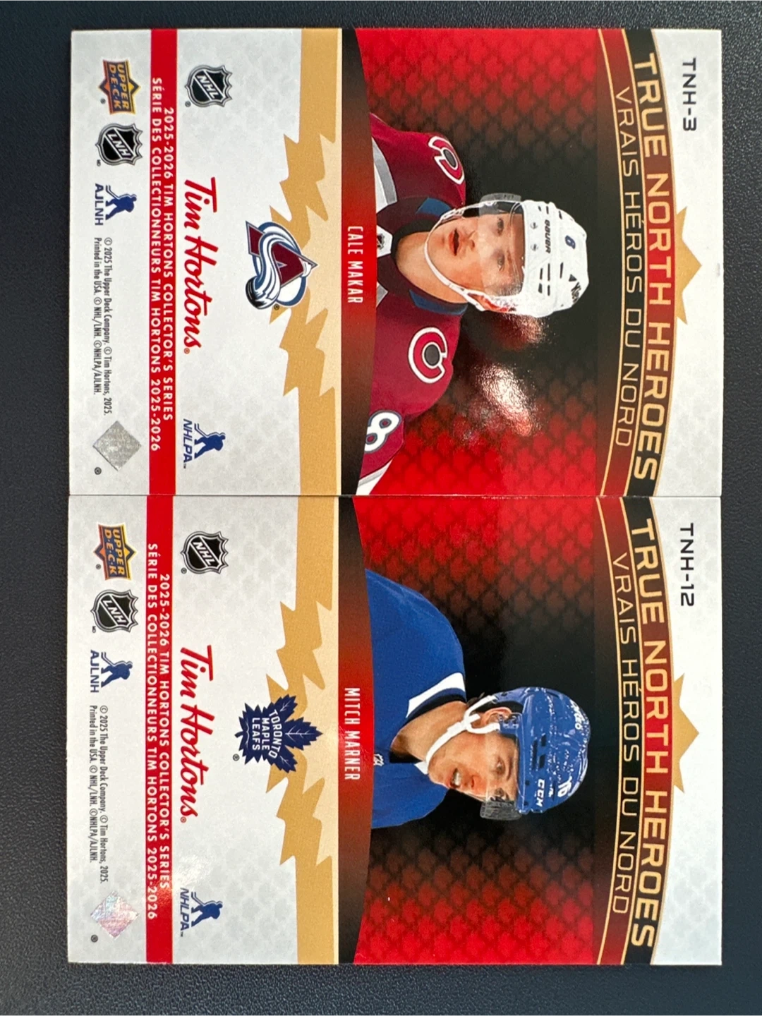 15Two Tim Hortons True North Heroes NHL hockey cards featuring Cale Makar and Mitch Marner! Both cards are in great condition and from the 2025-2026 collector's series