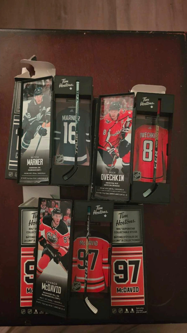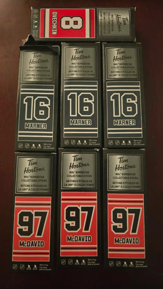 65Selling 7 Tim Hortons NHL Superstar Collectable Sticks. Includes: •3 × Connor McDavid (#97) •3 × Mitch Marner (#16) •1 × Alex Ovechkin (#8) All in great condition. Note: One of the Marner boxes is slightly torn, as shown in the picture. Perfect for collectors or hockey fans!