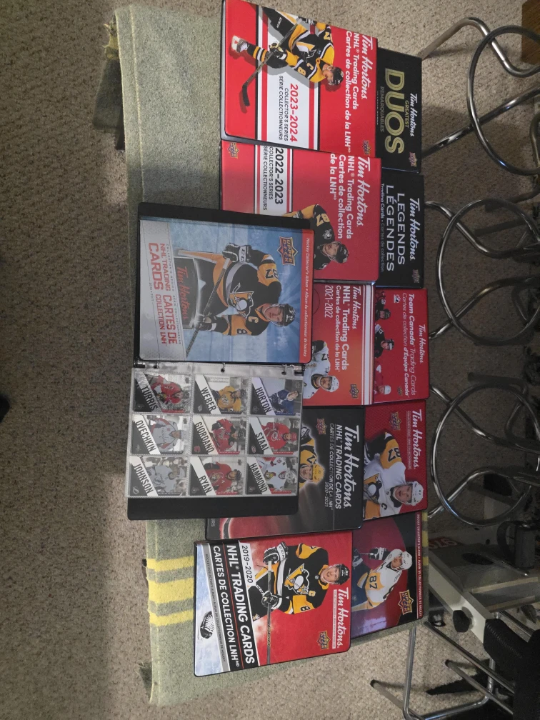 60SELLING A COLLECTION OF TIM HORTONS NHL TRADING CARDS MASTER SETS. GREAT FOR ANY HOCKEY CARD COLLECTOR! ALL CARDS ARE IN THE BINDER and SETS ARE COMPLETE. (MASTER) INCLUDES ALL WG-1 GRETZKY CARDS AND TIM HORTON SP-1 BONUS: WILL INCLUDE ALL DOUBLES ASKING 5000 MESSAGE ME FOR MORE INFORMATION SELLING AS A LOT. WILL NOT SELL INDIVIDUALLY PLEASE NO LOW BALLERS. THEY WILL BE IGNORED. 2015-2016 to 2023-2024 DUOS LEGENDS TEAM CANADA