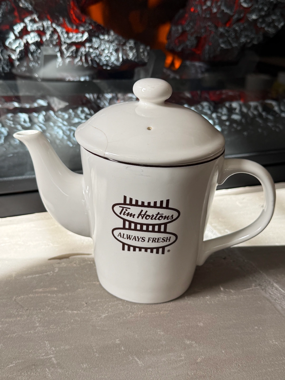 Selling a Tim Hortons teapot! It's white with the classic Tim Hortons logo. There's a small hairline crack on the lid but does not effect use and still a great piece for any Tim's collector!